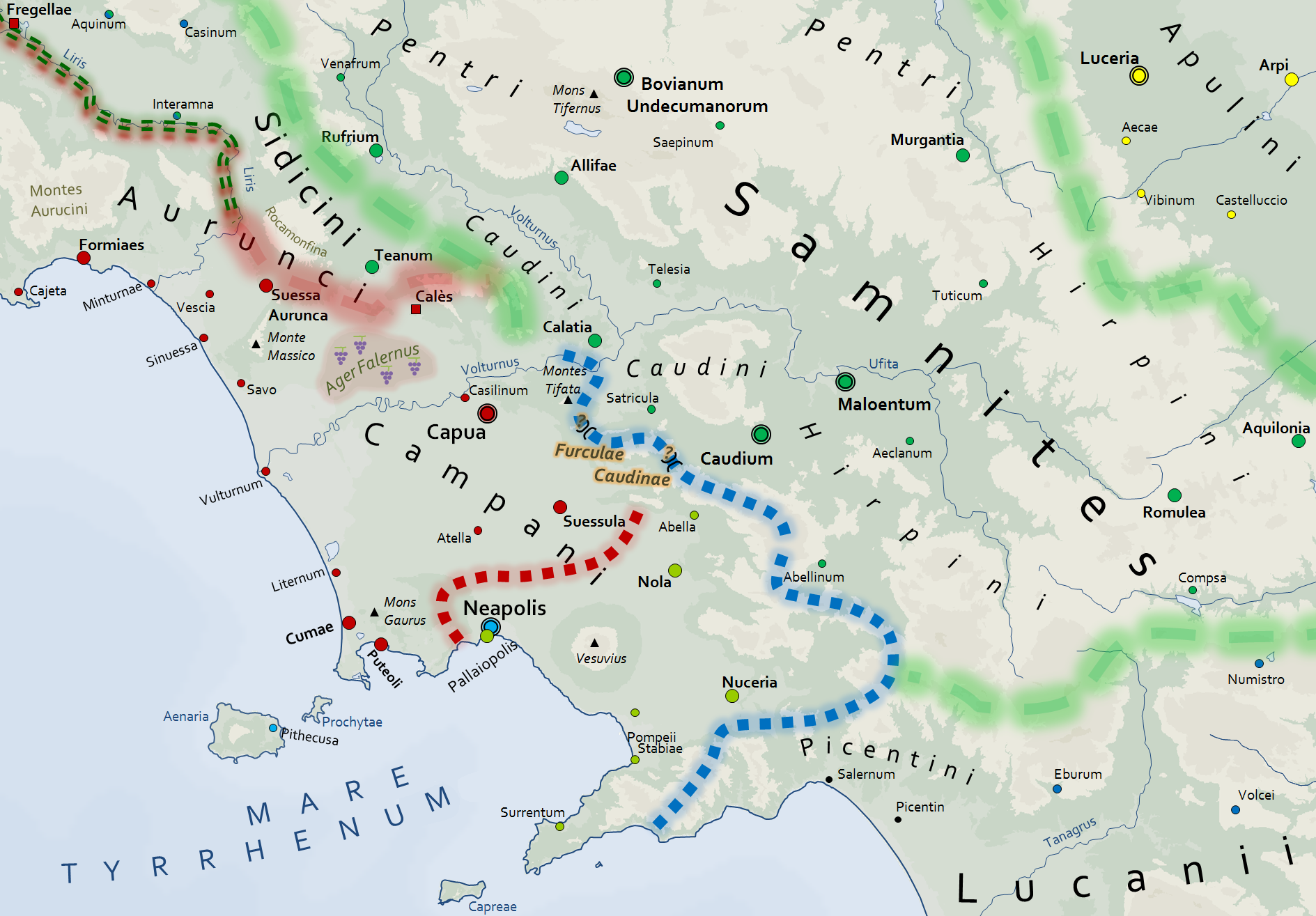 기원전 4세기경, 이탈리아 반도 남부는 아펜니노 산맥의 산악 지역에 사는 삼니움인의 세력, 연안부의 그리스인 식민 도시, 평야부의 캄파니아인 세력으로 나뉘어 있었다. 삼니움의 세력권이 확대되면서 캄파니아인의 영역과 충돌했고, 캄파니아인의 요청에 따라 로마가 개입하여 삼니움 전쟁이 발발했다. '''제1차 삼니움 전쟁''' (기원전 343년~기원전 341년)은 일진일퇴를 거듭하다 종결되었고, 로마는 카푸아를 중심으로 하는 캄파니아 지방을 얻어 주민에게 라틴 시민권을 부여했다. 제1차 삼니움 전쟁 후에도 캄파니아 지방의 긴장 상태는 계속되었고, 기원전 327년에 다시 삼니움인과 로마인 사이에서 분쟁이 일어나 '''제2차 삼니움 전쟁'''이 발발했다.