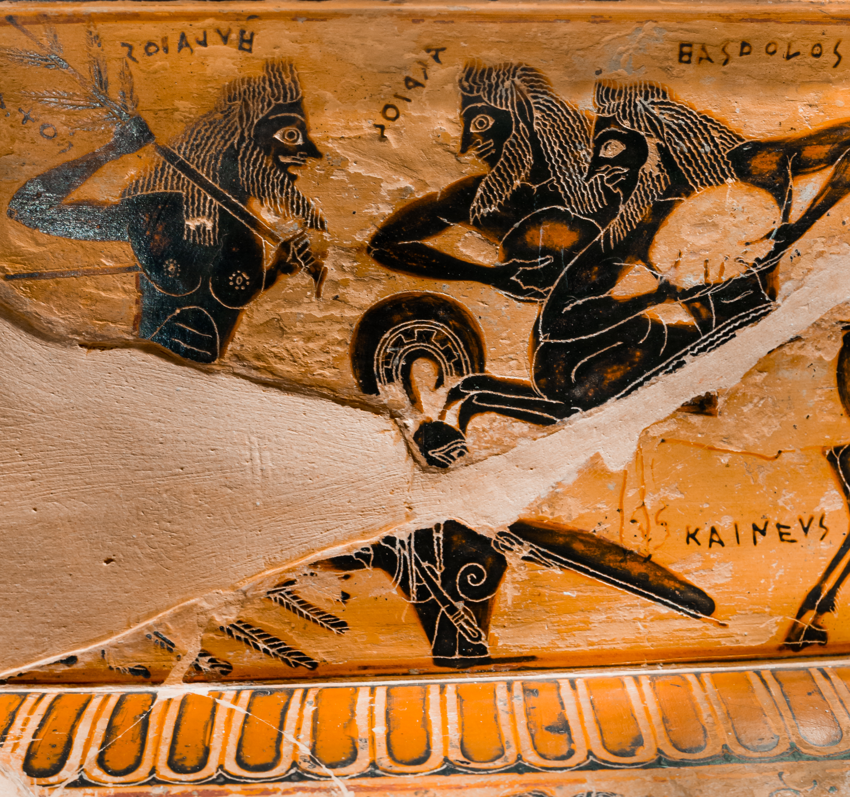 헤시오도스의 ''헤라클레스의 방패''에는 "그들의 왕 카이네우스 주위의 창을 든 라피테스족"이 켄타우로스와 싸우는 모습이 묘사되어 있는데, 켄타우로스는 전나무로 싸웠다.[13]