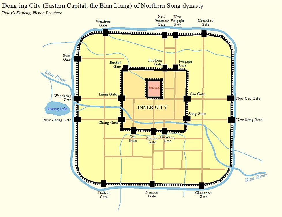 카이펑은 4개의 주요 운하가 교차하는 지점에서 상업 및 산업 중심지로 11세기에 중요성이 최고조에 달했다. 이 당시 도시는 세 개의 성벽으로 둘러싸여 있었고 인구는 60만에서 70만 명 사이였을 것으로 추정된다.[13]