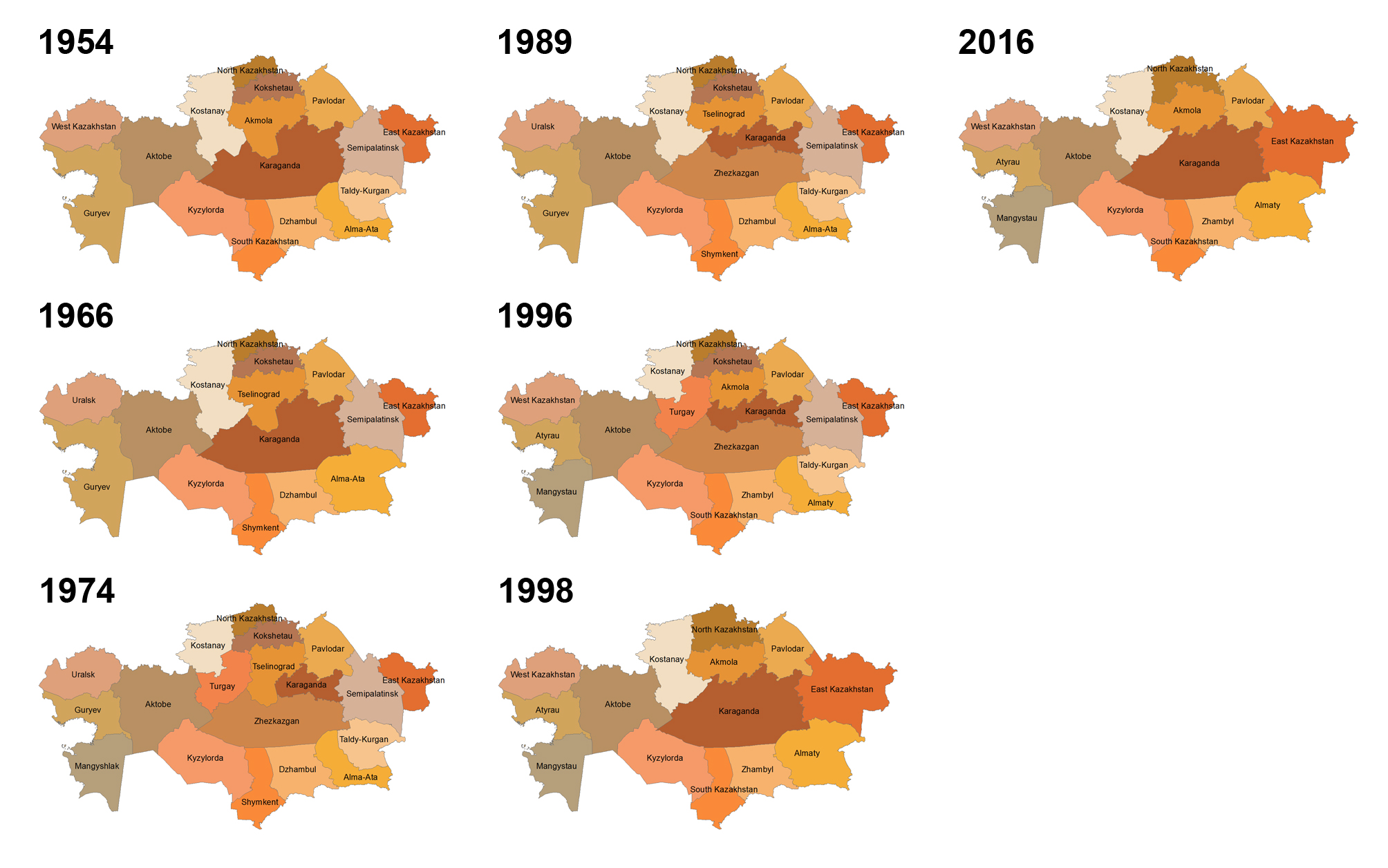 소비에트 연방으로부터 독립한 직후에는 카자흐 소비에트 사회주의 공화국 시대의 행정 구역을 그대로 사용했지만, 1990년대 후반에 잇따라 개혁이 이루어져 탈(脫) 러시아화가 진행되었다. 주(州)의 명칭은 카자흐어로 변경되었고, 주를 합병함으로써 러시아인의 비율을 낮췄다[6]。
