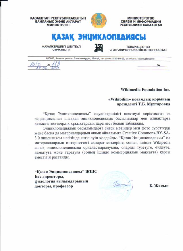 카자흐 소비에트 백과사전이 크리에이티브 커먼즈의 저작자 표시-동일 조건 변경 허락 라이선스 (CC BY-SA) 하에 문서를 인용하는 것을 허용하면서, 해당 백과사전의 자료가 카자흐어 위키백과에 통합되었다.[13] 이는 카자흐어 위키백과의 문서 수가 1년 만에 7,000개에서 100,000개로 급증하는 데 크게 기여했다.[13] 이러한 성장은 2011년 비영리 단체인 WikiBilim|위키빌림 재단영어에 의해 시작되었다.[14]4. 논란