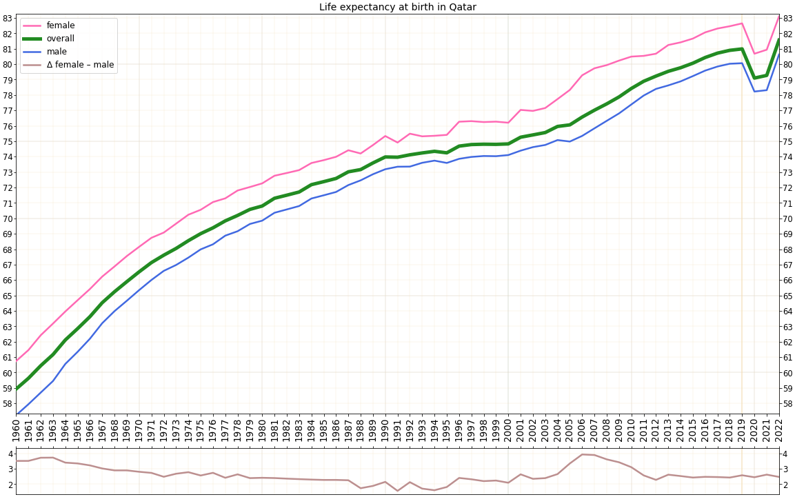 카타르의 인구는 지속적으로 증가하여 1950년 2.5만 명에서 2019년 283.2만 명으로 크게 증가했다. 2019년 기준 인구는 약 280만 명이며, 25~64세 인구가 대다수를 차지한다. 인구 성장률은 1.8%이며, 출생률, 사망률, 영아 사망률, 유아 사망률, 합계출산율, 기대 수명 등과 관련된 통계가 존재한다. 또한, 카타르는 외국인 비율이 높아, 이주 노동자가 노동력의 대부분을 차지하며, 출신지에 따라 사회적 분열이 존재한다. 카타르인은 베두인, 하다르, 아프리카계 아랍인으로 구성되며, 시민권 및 민족 집단에 대한 구분이 존재한다. 공식 언어는 아랍어이며, 영어 또한 널리 사용된다.