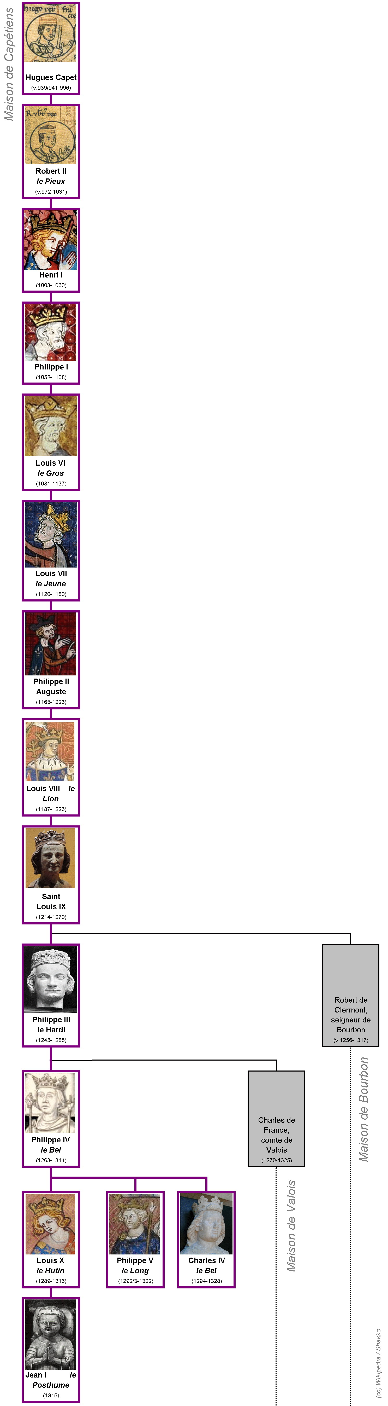 루이 10세, 장 1세, 필리프 5세, 샤를 4세의 짧은 통치 기간이 이어졌다. 필리프 4세의 아들들의 연이은 즉위는 카페 가문의 종말을 시작하게 하였다.