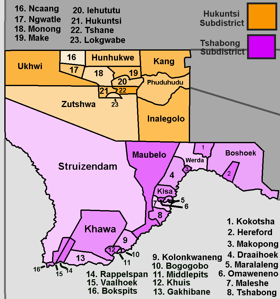 - '''후쿤치''' 하위 구역 소속 마을: 후쿤치, 훈후크웨, 이나레골로, 캉, 레후투투, 록그와베, 메이크, 모농, 은창, 응와틀레, 푸두후두, 차네, 우크위, 주츠와