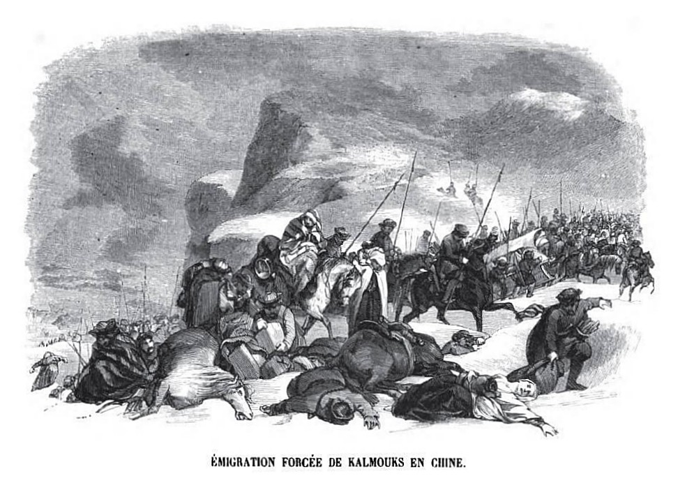 1770–1771년 겨울, 아이유카 칸의 증손자이자 마지막 칼미크 칸인 우바시 칸은 자신의 백성을 그들의 조상들의 고향인 준가리아로 돌려보내기로 결정했고, 당시 준가리아는 청나라의 지배를 받고 있었다.[6] 달라이 라마에게 연락하여 그의 축복을 요청하고 출발 날짜를 정했는데, 그는 점성술 차트를 참조하여 귀환 날짜를 정했지만, 출발 순간 볼가 강 얼음이 약해지면서 동쪽 강둑에서 방황하던 칼미크족만이 떠날 수 있었다. 오른쪽 강둑에 있던 사람들은 남겨지게 되었다.
