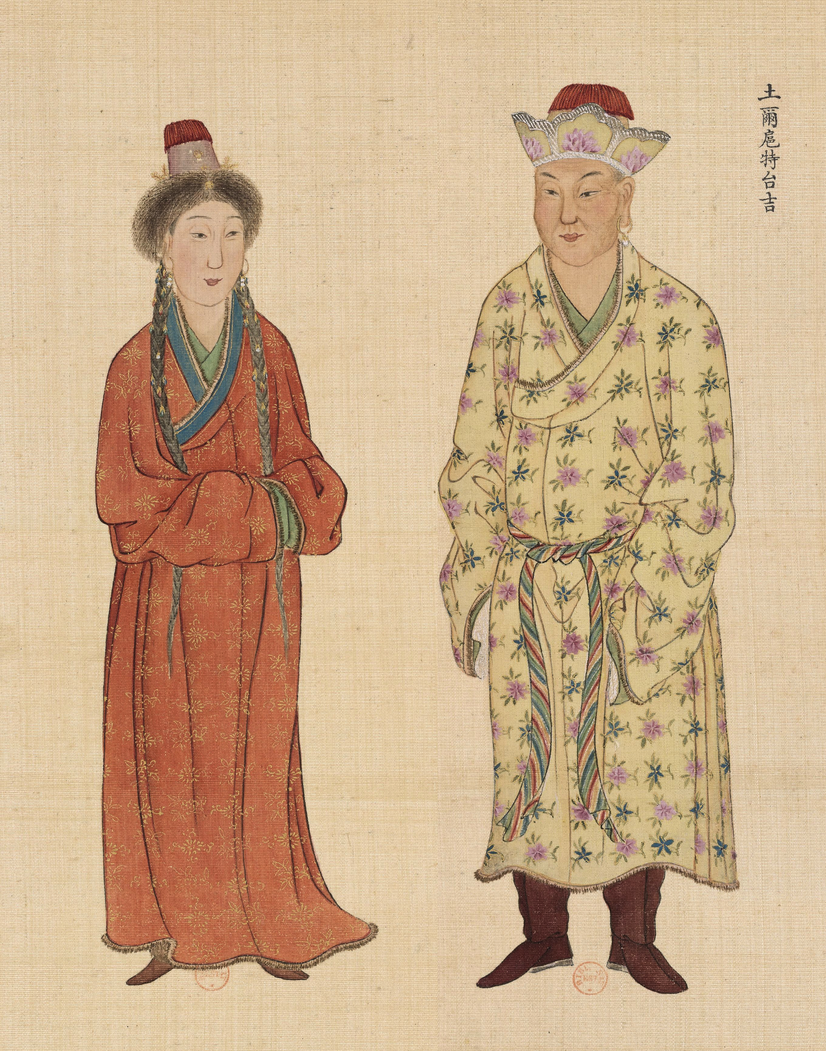 |thumb|left|토르구트족 타이이지(공)와 그의 아내 (土爾扈特台吉). 황청직공도, 1769. 토르구트족은 칼미크족의 조상이었다.]]