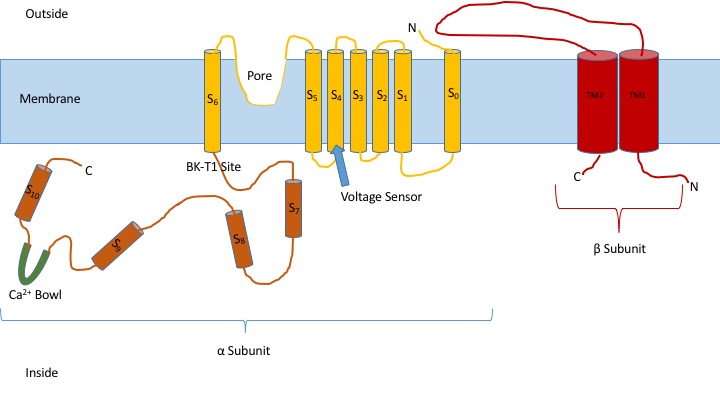 큰 전도성 칼슘 활성화 칼륨 통로(BK)의 간단한 다이어그램. 이 채널군에 속하는 다른 아형에 대해서도 유사한 구조를 가정할 수 있다.
