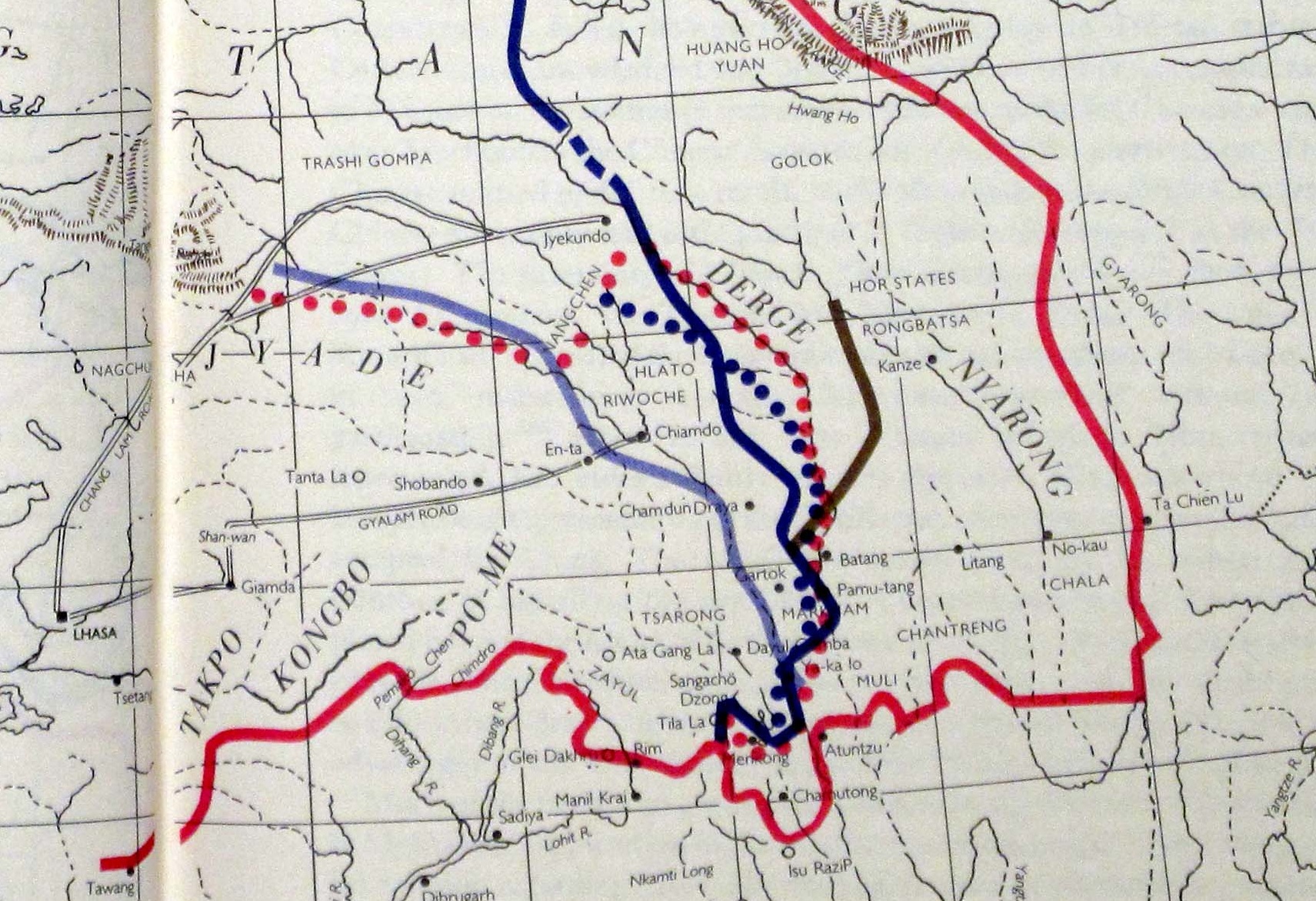 중화민국의 캄 지역 지배: 서쪽의 연한 파란색 선은 1912년~1917년 경계를 나타내며, 이후 1918년~1932년 동안 중화민국은 갈색 선까지 밀려났다. 1945년에는 점선으로 표시된 빨간색 선에 이르렀다. 진한 파란색은 중화민국이 거부한 심라협정 경계이다.