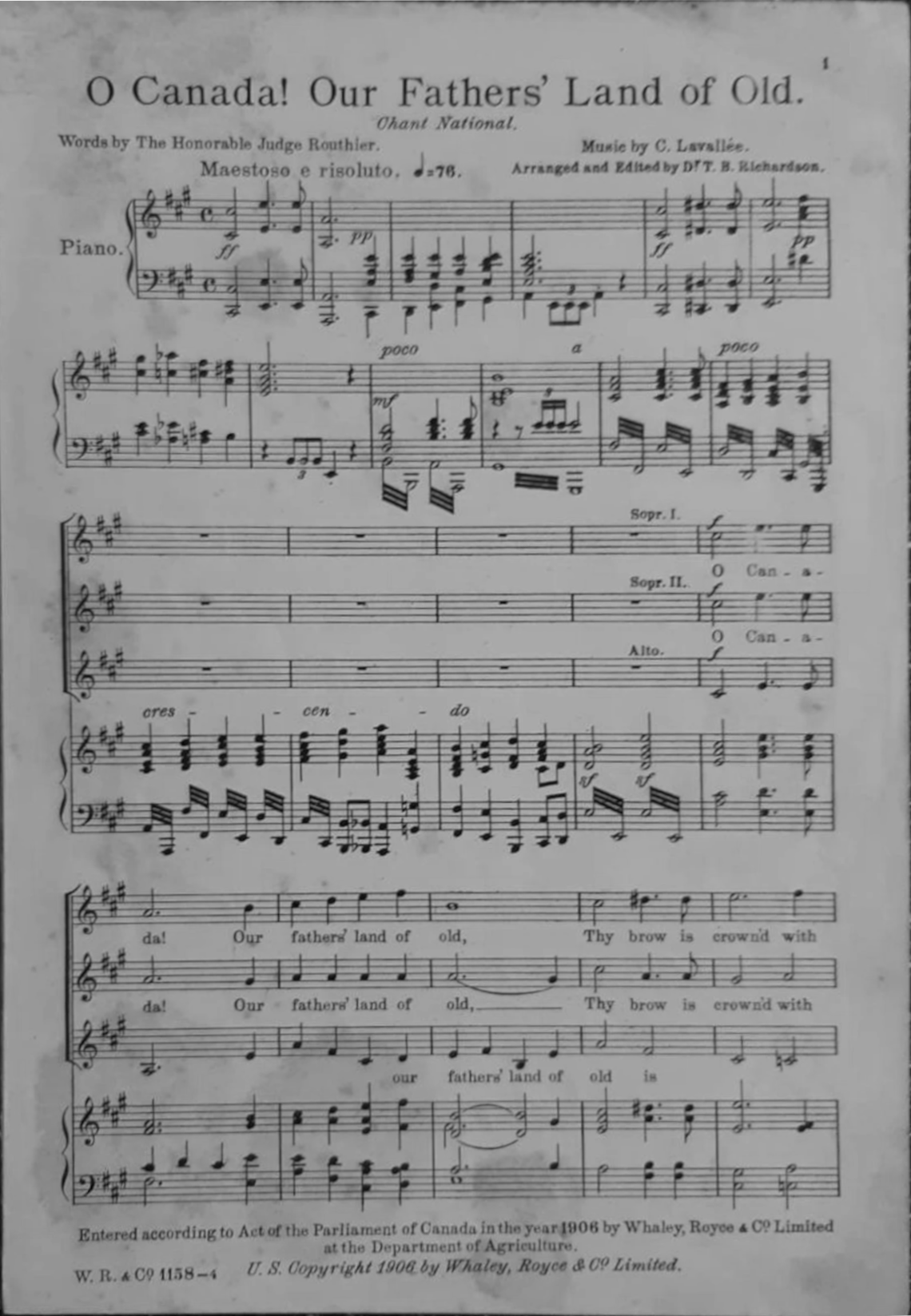 아돌프-바실 루티에 경이 프랑스어 가사 "오 캐나다(O Canada)"를 작사하고 칼릭사 라발레가 작곡하여 생-장-밥티스트 협회를 위한 프랑스계 캐나다인 애국가로 제작되었다. 1880년 6월 24일 퀘벡 시에서 열린 생-장-밥티스트의 날 연회에서 처음으로 불렸으며, 당시 루티에가 작사한 "샹트 나시오날(Chant National)"은 프랑스어 사용 인구 사이에서 국가로 인기를 얻었다.[18] 1867년 이후 "신이여, 국왕을 지켜주소서(God Save the Queen)"와 "영원한 단풍잎(The Maple Leaf Forever)"은 영어 사용 캐나다에서 비공식 국가로 경쟁하였다. "오 캐나다"는 1901년 콘월 공작과 콘월 공작 부인(후에 조지 5세와 메리 왕비)이 캐나다를 순방했을 때, 한 무리의 학생들이 이 노래를 부르면서 경쟁에 합류했으며,[1] 퀘벡 외부에서 이 노래가 불린 최초의 공연으로 알려져 있다.[19]5년 후, 토론토의 Whaley and Royce 회사는 프랑스어 가사와 토마스 베드포드 리처드슨이 처음으로 번역한 영어 가사를 함께 출판했으며, 1908년에는 잡지 ''콜리어스(Collier's Weekly)''가 "오 캐나다"의 새로운 영어 가사를 공모했다. 이 공모전에서는 머시 E. 파웰 맥컬로흐가 우승했지만, 그녀의 가사는 널리 받아들여지지 않았다.[18] 많은 사람들이 루티에의 가사를 영어로 번역했지만, 가장 인기 있는 버전은 변호사이자 몬트리올 시 서기였던 로버트 스탠리 웨어가 1908년에 만든 것이었다. 웨어의 1908년 가사에는 종교적 언급이 없었고, 1913년에 "너는 우리 안에서 명령한다(thou dost in us command)"라는 구절을 "너는 모든 네 아들 안에서 명령한다(in all thy sons command)"로 변경하기 전에 사용했다.[1][20][26] 1926년에는 종교적 내용의 네 번째 절이 추가되었다.[21] 약간 수정된 버전이 1927년 연방 다이아몬드 주빌리를 위해 공식적으로 출판되었고, 점차 이 노래의 가장 널리 받아들여지고 불리는 버전이 되었다.[1]