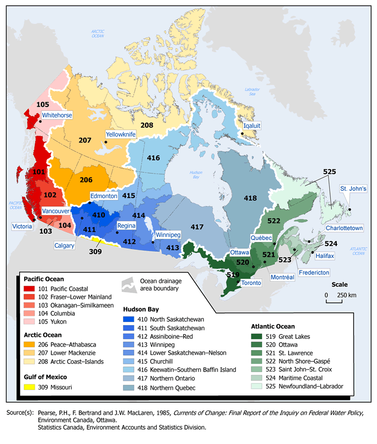 대서양 유역은 대서양 연안 주 전체(퀘벡-래브라도 경계의 일부는 대서양-북극해 대륙 분할선에 고정되어 있음), 대부분의 퀘벡 거주 지역, 온타리오 남부의 넓은 지역을 배수한다. 경제적으로 중요한 세인트로렌스강과 그 지류, 특히 사게네, 매니쿠아간, 오타와강에 의해 대부분 배수된다. 오대호와 니피곤 호수 역시 세인트로렌스강으로 배수된다. 처칠강과 세인트존강은 캐나다 대서양 유역의 다른 중요한 요소이다.[51]