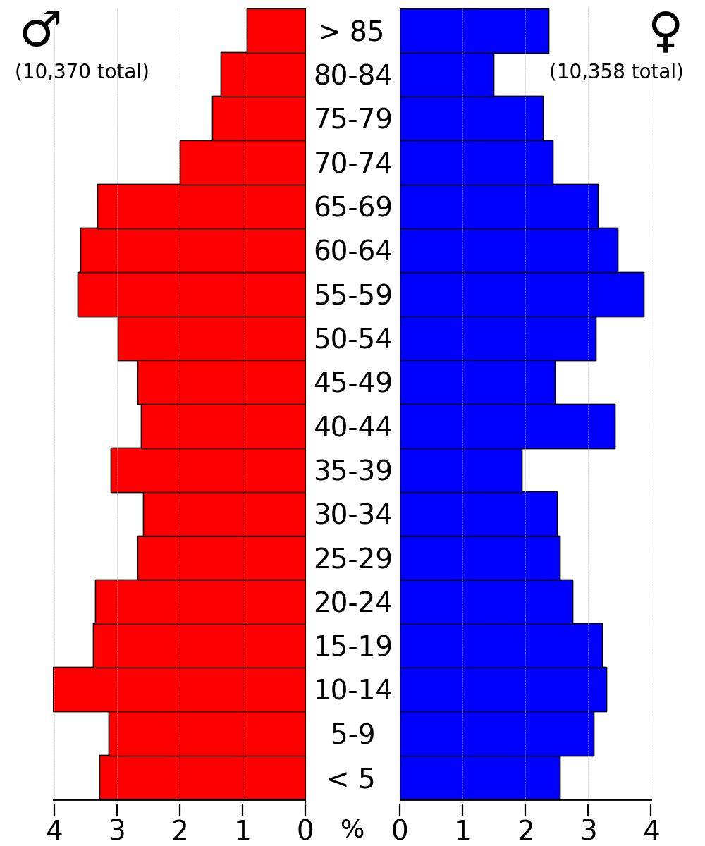 연령별로는 18세 미만 26.9%, 18~24세 7.4%, 25~44세 25.9%, 45~64세 21.0%, 65세 이상 18.7%였다. 연령 중앙값은 39세였다. 여성 100명당 남성은 95.1명, 18세 이상은 92.0명이었다.