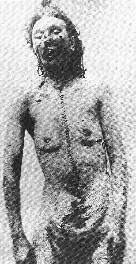 에도우스의 시신 안치소에서의 사진. 검시에서 봉합한 후에 촬영.