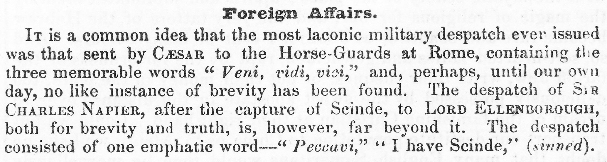 밤버 개스코인의 ''영국 백과사전''(1993)에 따르면, 캐서린 윙크워스는 찰스 제임스 네이피어 장군이 인도 신드 정복을 위해 무자비하고 승인되지 않은, 하지만 성공적인 작전을 펼쳤다는 소식을 듣고, 신드 점령 후 네이피어 장군이 인도 총독에게 보낸 전갈의 제목은 "Peccavi"여야 한다고 그녀의 교사에게 말했다. 이는 "나는 죄를 지었다"라는 뜻의 라틴어이며, "I have Sindh"에 대한 말장난이었다.[12] 그녀는 이 농담을 ''펀치''지에 보냈고, 잡지는 1844년 5월 18일에 이를 게재했다.