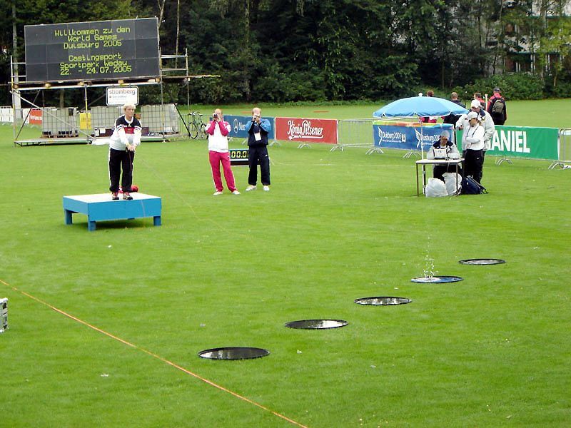2005년 뒤스부르크에서 열린 월드 게임에서 참가자 야나 마이젤이 목표 풀에 플라이를 캐스팅하고 있다.