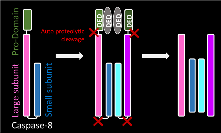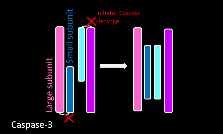 적절하게 이합체화되면 캐스페이스는 도메인 간 링커 영역에서 절단되어 크고 작은 서브 유닛을 형성한다. 이 절단은 활성 부위 루프가 효소 활동에 유리한 형태를 취하도록 한다.[46]