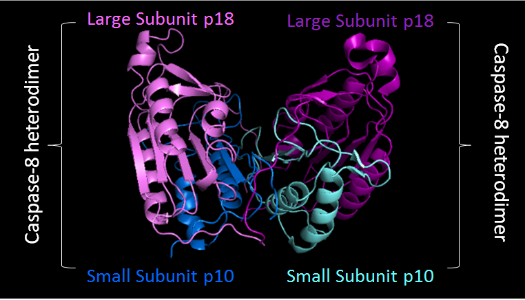 개시자 캐스페이스 (캐스페이스 8) | 개시자 프로캐스페이스는 다른 프로캐스페이스의 모집을 허용하는 프로 도메인을 가지고 있으며, 이는 이후에 이합체화된다. 두 프로캐스페이스 분자는 자가 촉매 작용에 의해 절단된다. 이것은 프로 도메인의 제거와 큰 서브유닛과 작은 서브유닛 사이의 링커 영역의 절단으로 이어진다. 헤테로 테트라머가 형성된다. | ![]() | ![]() |