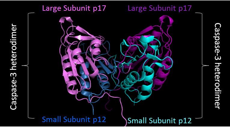 실행자 캐스페이스 (캐스페이스 3) | 실행자 캐스페이스는 구성적으로 동종이합체로 존재한다. 빨간색으로 나타난 절단은 개시자 캐스페이스가 실행자 캐스페이스를 절단하는 영역을 나타낸다. 결과적으로 각 캐스페이스 3의 작고 큰 서브 유닛이 연결되어 헤테로 테트라머가 된다.[47] | ![]() | ![]() |