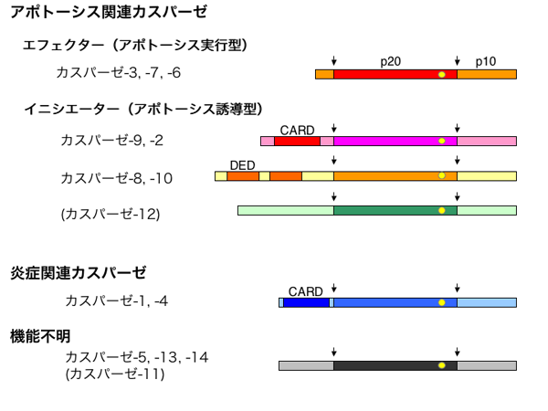 대부분의 캐스페이스는 프로그램 세포사멸에 관여한다. 다음 표에 요약되어 있다. 효소는 개시, 이행, 염증의 세 가지 유형으로 세분된다.[7]