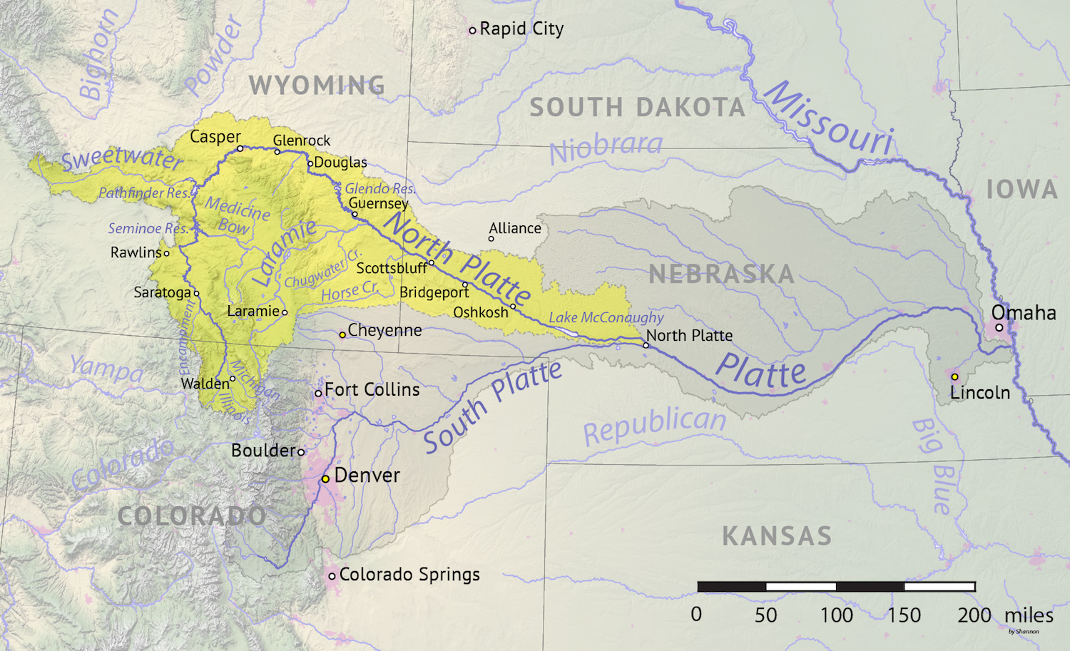 미래의 네브래스카와 와이오밍 주에 위치한 플랫 강은 전형적으로 많은 수로와 섬을 가지고 있었고, 심지어 카누로도 멀리 이동하기에는 너무 얕고, 구불구불하며, 진흙투성이이고, 예측 불가능했다.[52] 그러나 플랫 강 계곡은 물, 풀, 버팔로 칩등을 제공하며, 서쪽으로 향하는 마차 통로를 제공했다.[52] 진흙투성이이며, 폭이 약 1.6km이고 얕은 (5cm~150cm) 플랫 강 양쪽으로 길이 있었다.