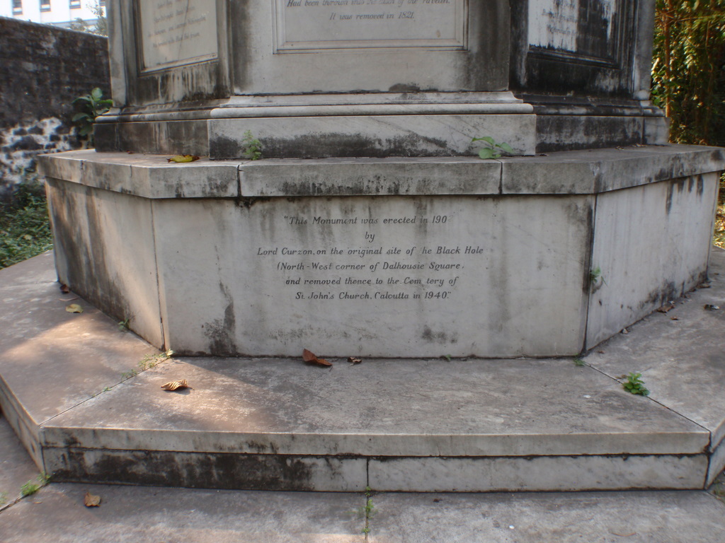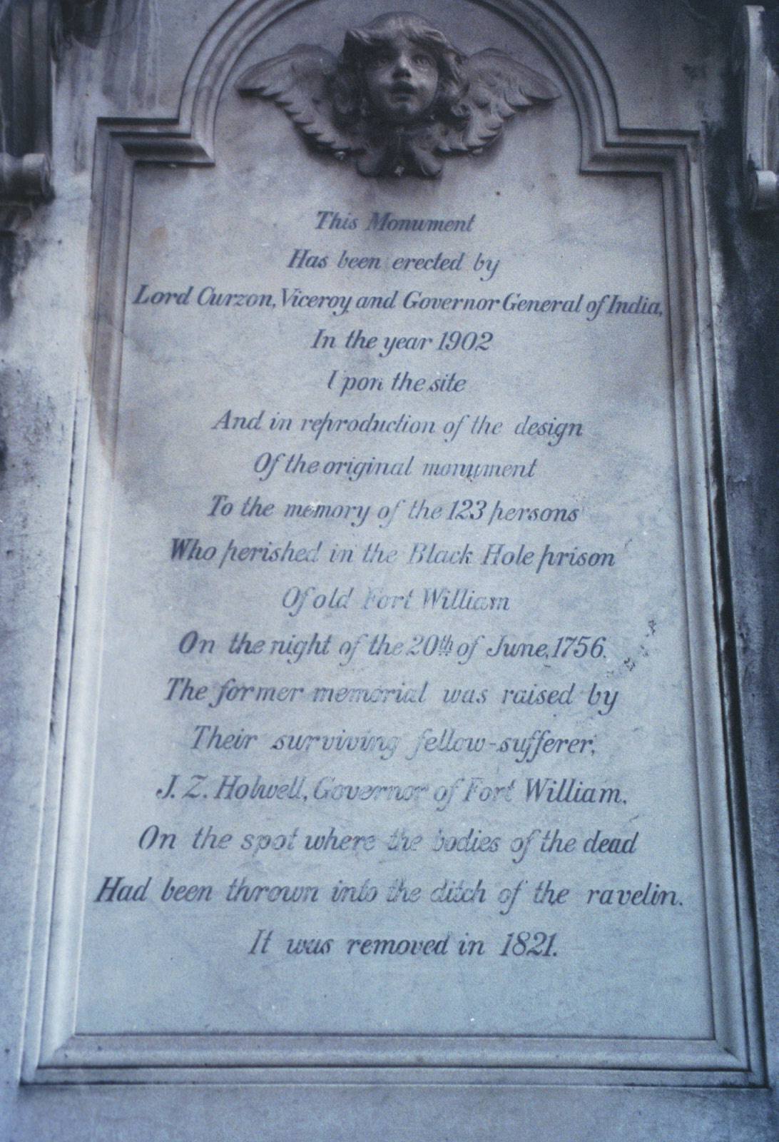 희생자들을 기리기 위해 영국인들은 15미터 높이의 오벨리스크를 세웠다. 현재 이 기념비는 콜카타의 (성공회) 세인트 존 교회 묘지에 있다. 홀웰은 '블랙홀' 부지에 희생자들을 기리는 기념비를 세웠지만, 어느 시점(정확한 날짜는 불확실함)에 사라졌다.[13] 1899년 커즌 경은 부왕이 되자 그 자리에 아무것도 없다는 것을 알아차리고 홀웰의 이전 기념비를 언급하면서 새로운 기념비를 의뢰했다. 이 기념비는 1901년 달하우지 광장(현재 B. B. D. 바그)의 모퉁이에 세워졌으며, 그곳이 '블랙홀'이 있던 곳이라고 한다.[13]7. 2. 커즌 경의 기념비 건립