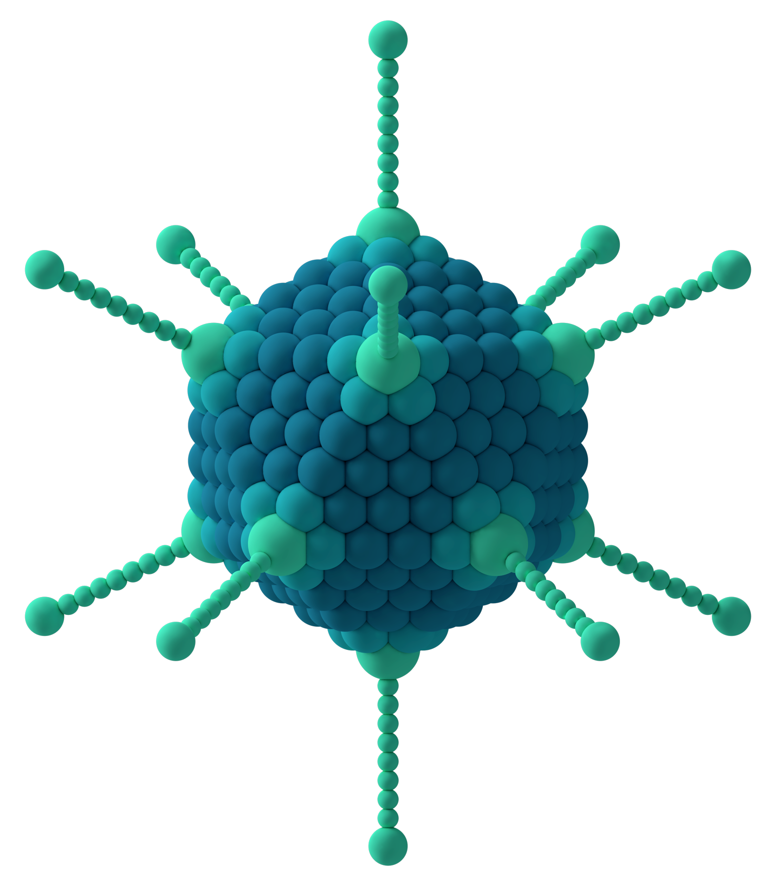 - 정이십면체: 많은 바이러스에서 발견되는 형태로, 20개의 삼각형 면과 12개의 꼭짓점으로 구성된다. 도널드 캐스퍼와 애런 클루그가 제안한 "준등가 원리"에 따라 캡소미어 배열을 분류할 수 있다.[13]
