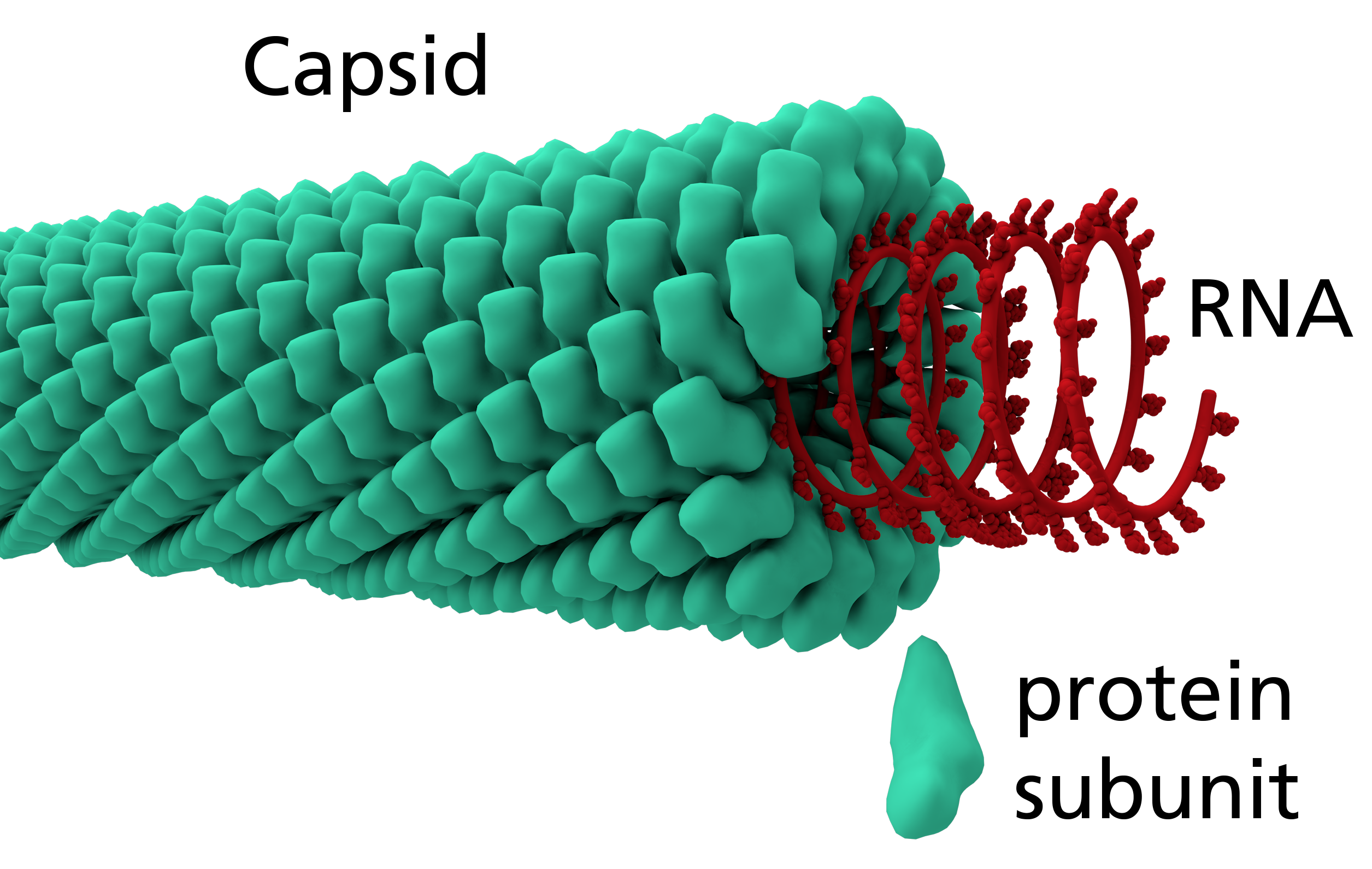 막대 모양의 식물 바이러스는 주로 나선 대칭을 가진다.[36] 나선 대칭은 1차원 대칭과 2차원 대칭으로 나뉘며, 이 두 대칭 수로 구조를 나타낼 수 있다. 나선은 ''P'' = ''μ'' x ''ρ''로 표현되는데, 여기서 P는 나선의 피치(pitch), ''μ''는 나선이 한 바퀴 돌 때 필요한 단위체의 수, ''ρ''는 각 단위의 높이 차이를 의미한다.[37] 나선형 캡시드는 열린 구조를 가지므로, 캡시드의 길이는 개체마다 다르게 나타난다.[38] 담배모자이크바이러스는 단일 가닥 양성 RNA 바이러스로, 나선형 캡시드에 대해 가장 많이 연구된 바이러스이다.[36] 담배모자이크바이러스의 경우 각 단위체 하나당 세 개의 RNA 염기가 부착되어 있다. 인플루엔자바이러스 A형은 리보핵단백질이 나선형 캡시드를 이룬다. 담배모자이크바이러스는 나선이 한 바퀴 도는데 16.33개의 단백질이, 인플루엔자바이러스 A형은 28개의 아미노산이 필요하다.[36]