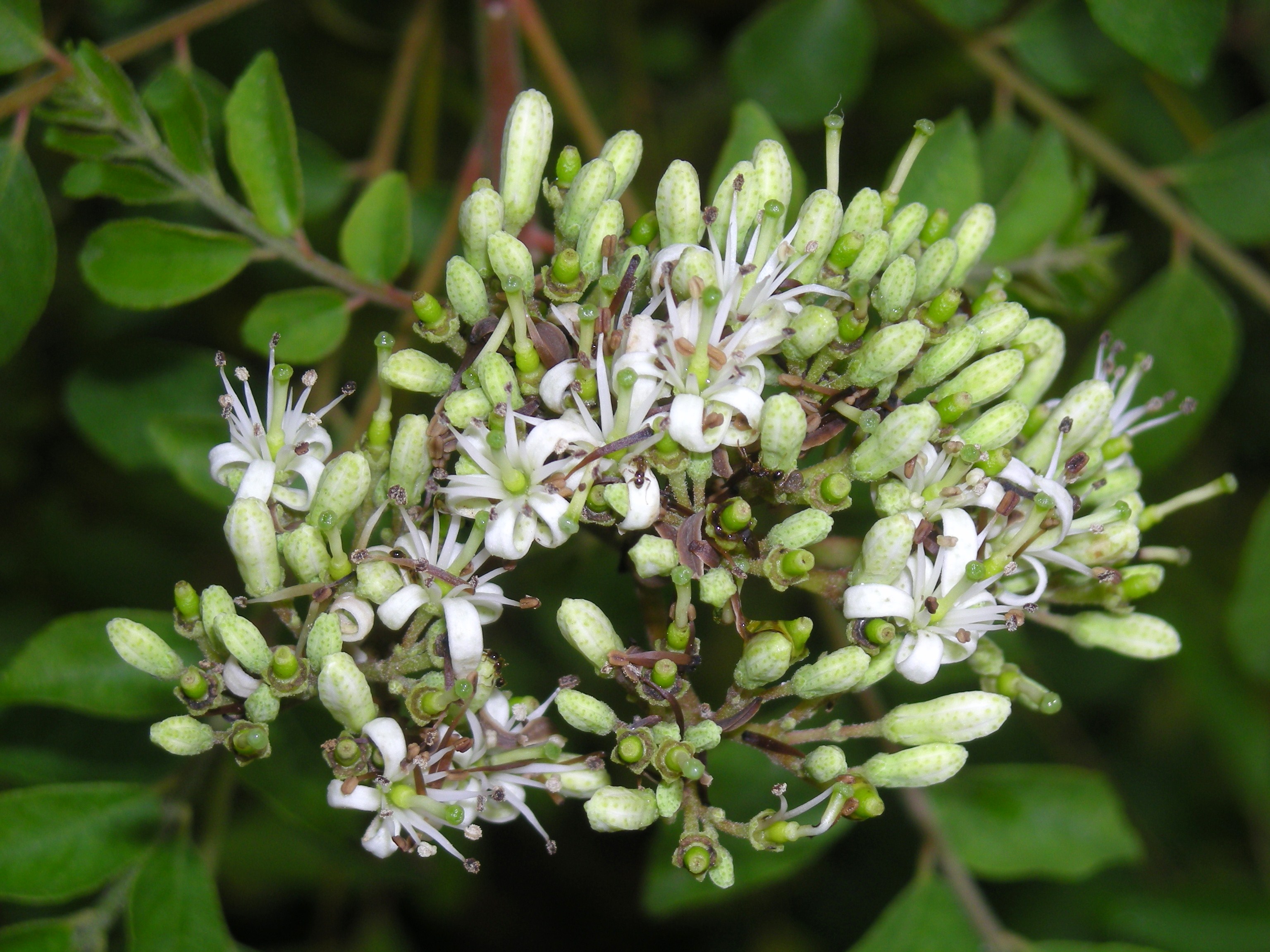 상록 활엽 관목 또는 교목으로, 성장하면 높이 4~6m, 줄기는 지름 40cm 정도가 된다. 잎은 기수 우상 복엽으로 11~21개의 소엽은 각각 길이 2~4cm, 너비 1~2cm이며, 가장자리에 잔 톱니가 있다. 꽃은 흰색으로 작다. 열매는 작은 알갱이로, 익으면 검은색이 되지만 씨앗에 독이 있다.