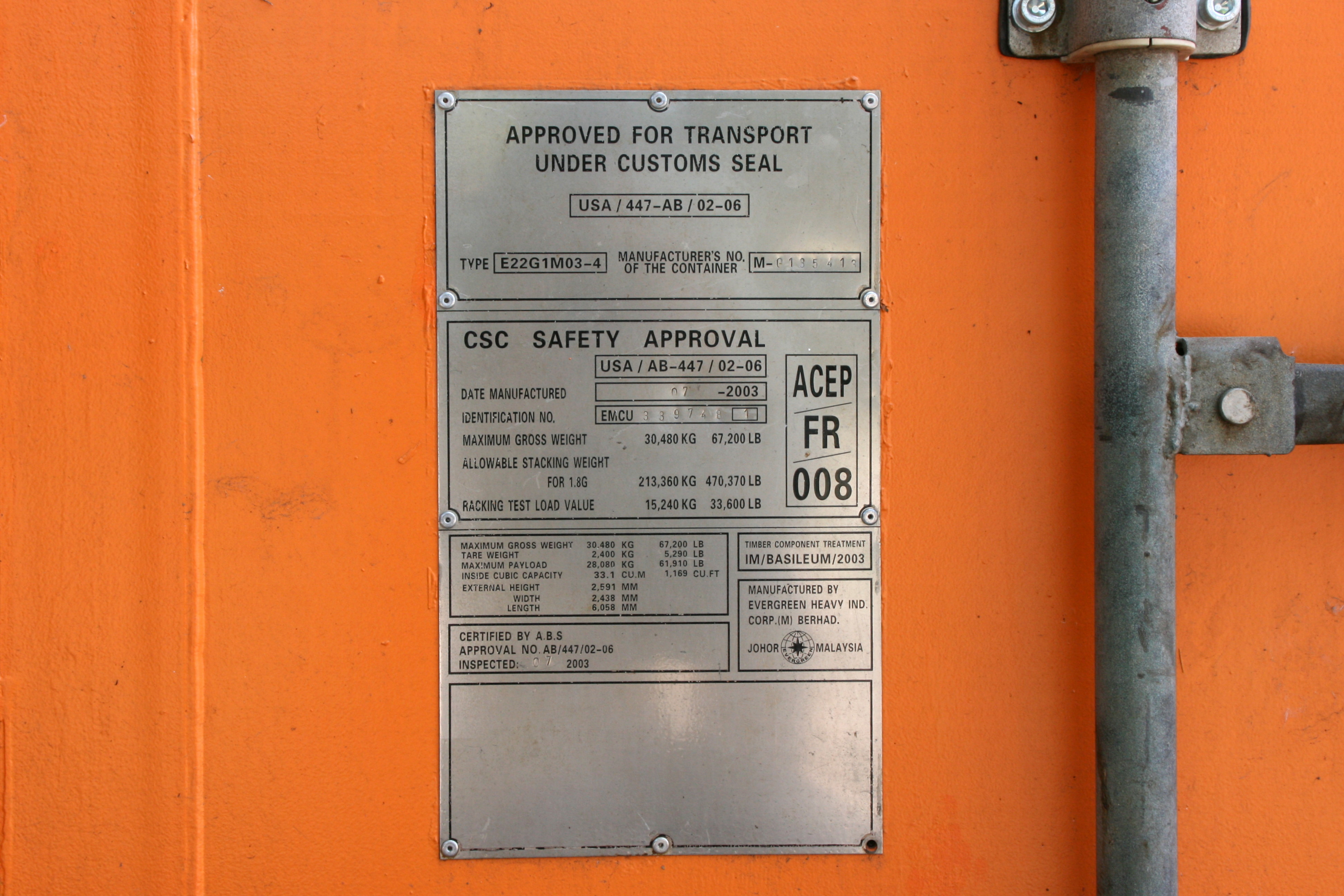 1972년 국제해사기구의 컨테이너 안전 협약(CSC)은 컨테이너의 안전한 취급 및 운송에 관한 것이다. 이 협약은 국제적으로 운송되는 모든 컨테이너에 CSC 안전 승인 판을 부착하도록 규정하고 있다.[27][28] 여기에는 컨테이너의 연식, 등록 번호, 치수 및 중량, 강도 및 최대 적재 능력 등과 같은 필수 정보가 포함되어 있다.