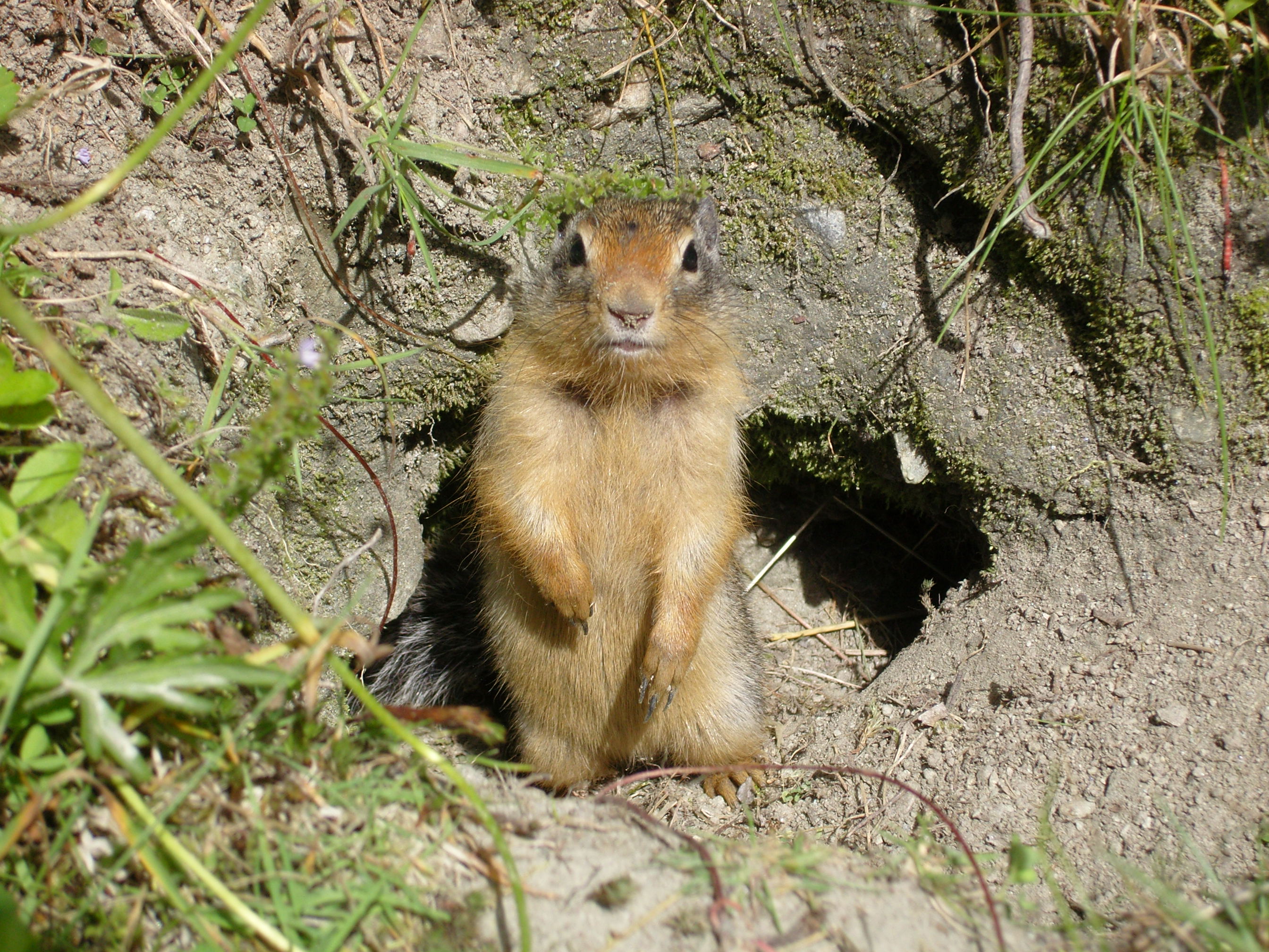 포유류학자 버논 올랜도 베일리(Vernon Orlando Bailey)는 빙하 국립공원의 파이건 고개(Piegan Pass) 근처 해발 약 2133.60m에서 컬럼비아땅다람쥐 굴을 조사했다. 7월 말, 성체 암컷이 매일 굴 입구로 신선한 흙을 가져오는 것을 발견했다. 그 동물을 제거하고 굴을 발굴하여 조사했다. 입구의 흙더미는 약 8gal의 흙으로 구성되었다. 흙은 축적된 날짜가 다양했는데, 하층은 이전 계절부터 굳어진 것으로 보였다. 굴 자체에는 외부 관찰로부터 숨겨진 두 개의 대체 입구가 있었는데, 이는 포식자가 굴에 들어올 경우 탈출로 역할을 했을 가능성이 높다. 굴의 주요 통로는 직경이 약 약 8.89cm였다. 굴 전체에 걸쳐 간격을 두고 챔버가 설치되어 발굴된 흙을 보관하거나 포식자로부터 안전한 피난처를 제공했을 수 있다. 입구에서 약 약 2.44m 떨어진 곳에 둥지가 건설되었다. 둥지 자체는 지역에 풍부한 "빙하 풀"(''Luzula parviflora'') 잎으로 만들어졌다. 다양한 연령의 풀이 발견되어 둥지가 이전 계절에도 사용되었음을 시사했다. 흙 속 더 깊은 인접한 챔버에는 오래된 버려진 둥지가 있었는데, 부분적으로 배설물로 채워져 땅다람쥐의 화장실 역할을 했다.