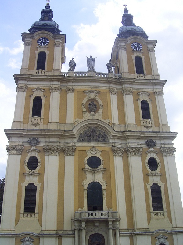 두 개의 탑은 멀리서도 볼 수 있다. 그 사이에는 연결된 다리가 있으며, 다리 위에는 세 개의 동상이 있다. 성 베드로와 바울(1755)과 중앙의 성모 마리아(야노스 하트만, 1881)가 있다. 그 아래에는 두 개의 이오니아식 기둥이 받치고 있는 팀파눔이 있다. 팀파눔에는 요제프 안드레카의 부조가 있다. 그 제목은 "헝가리의 수호자"이다. 성당 남쪽에는 1938년 제노 보리가 제작한 아스트릭의 부조가 있다.