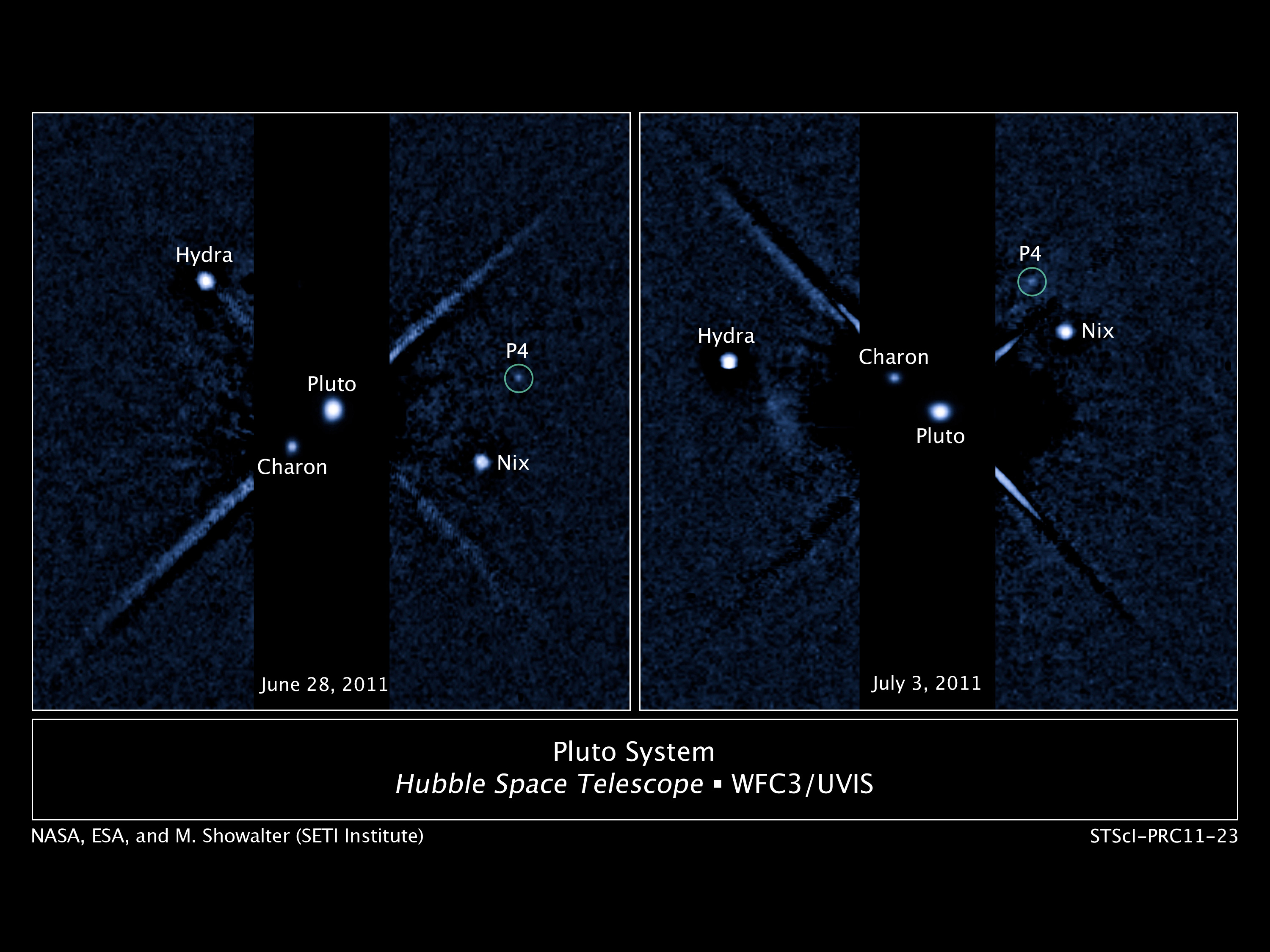 2011년 7월 20일, 미국 항공우주국(NASA)은 허블 우주망원경을 이용하여 명왕성의 새로운 위성을 발견했다고 발표하였다. 이 위성은 임시로 P4(또는 S/2011 P 1)라는 명칭이 부여되었으며, 명왕성으로부터 약 59000km 거리에서 위성 닉스의 공전 궤도 바깥쪽, 위성 히드라의 공전 궤도 안쪽을 약 31일 주기로 공전하는, 직경 48~62 km 정도의 작은 위성으로 확인되었다. 이 위성은 명왕성의 고리를 찾던 가운데 2011년 6월 28일 처음으로 관측되었고, 뒤이어 7월 3일과 7월 18일의 관측에 의해 그 존재가 확정되었으며 공전 궤도와 공전 주기도 계산되었다. 2011년 7월 현재 명왕성의 고리는 확인되지 않고 있다.[14][10]