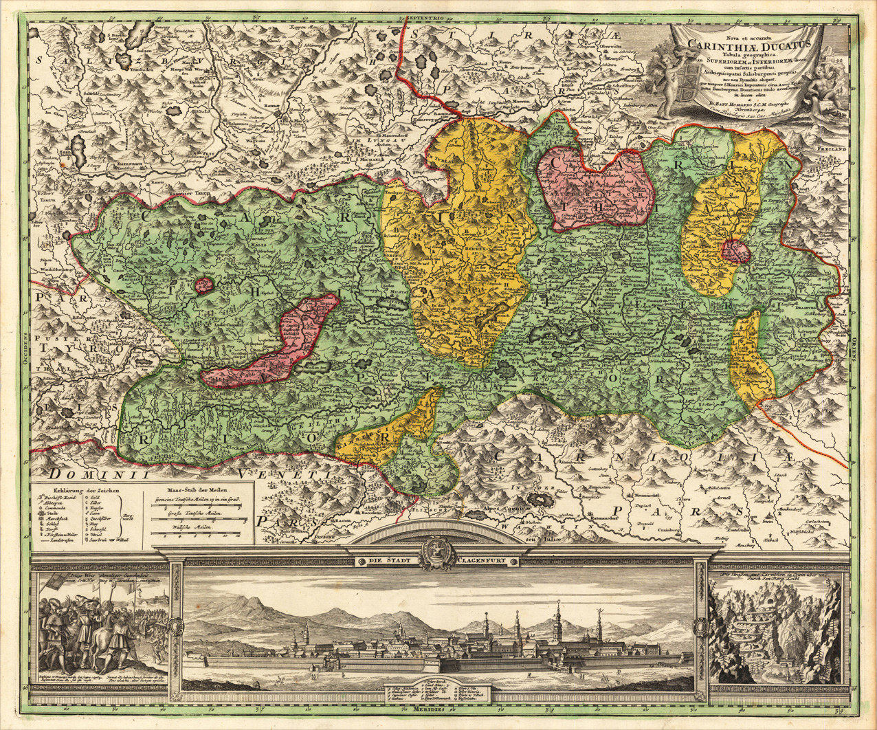 18세기 초 케른텐 지도, 잘츠부르크(분홍색)와 밤베르크(노란색)가 소유한 봉토 표시