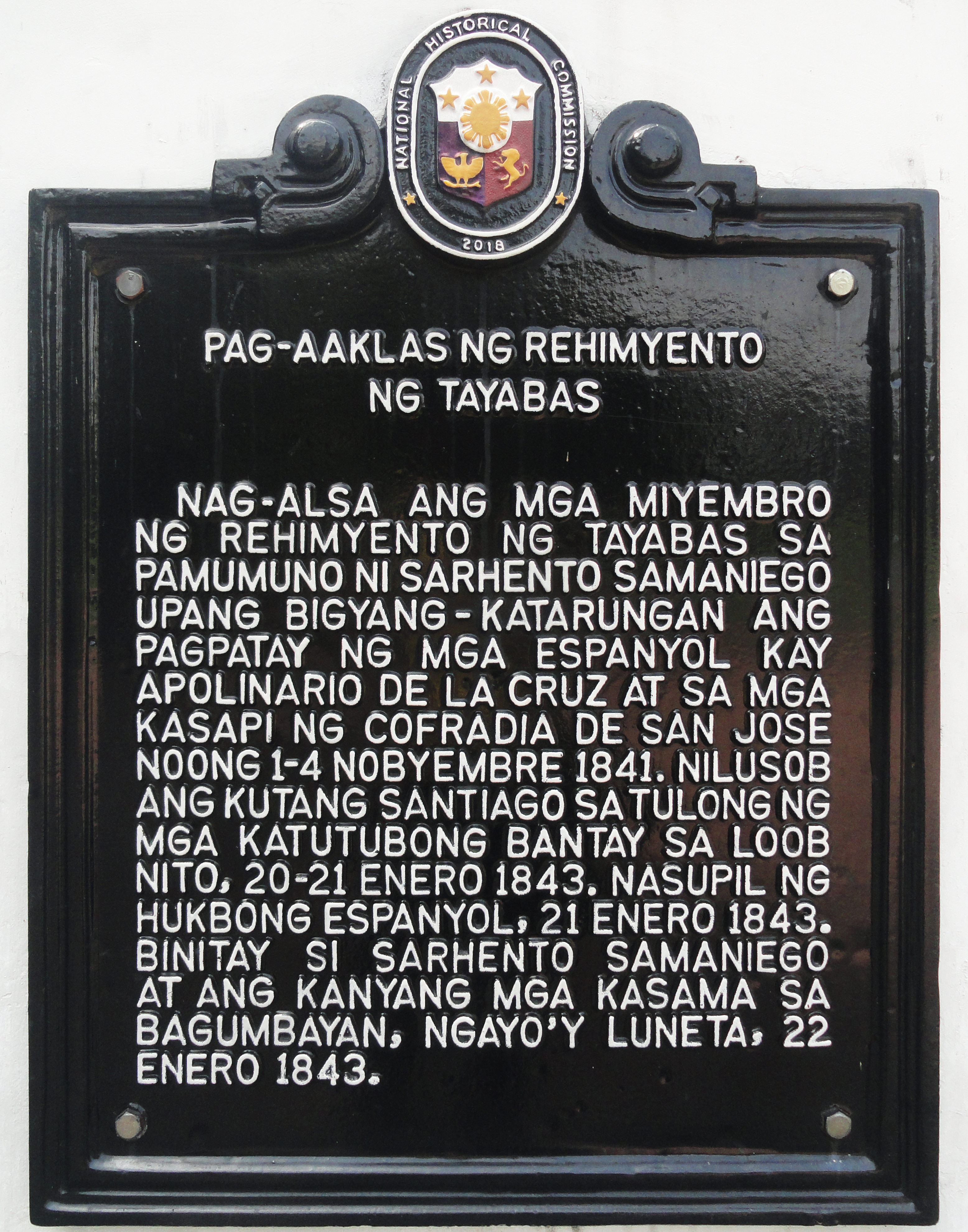 형제단 반란 이후 수년이 지난 1843년 1월 20일, 이리네오 사마니에고 상사가 이끄는 타야바스 연대가 스페인에 반기를 들어 산티아고 요새와 인트라무로스 인근 지역을 점령했다. 이는 필리핀 역사상 산티아고 요새와 마닐라를 성공적으로 점령한 유일한 토착 세력이었다. 타야바스 연대는 필리핀인들에게 처음으로 "독립"을 외치며 스페인에 반란을 일으킬 것을 촉구했다.[25][26] 그러나 다음 날, 산티아고 요새의 문은 왕당파 병사들에 의해 열렸다. 치열한 전투 끝에 반란군은 왕당파 군대에 패했고, 사마니에고와 그의 추종자 81명이 같은 날 처형되었다.