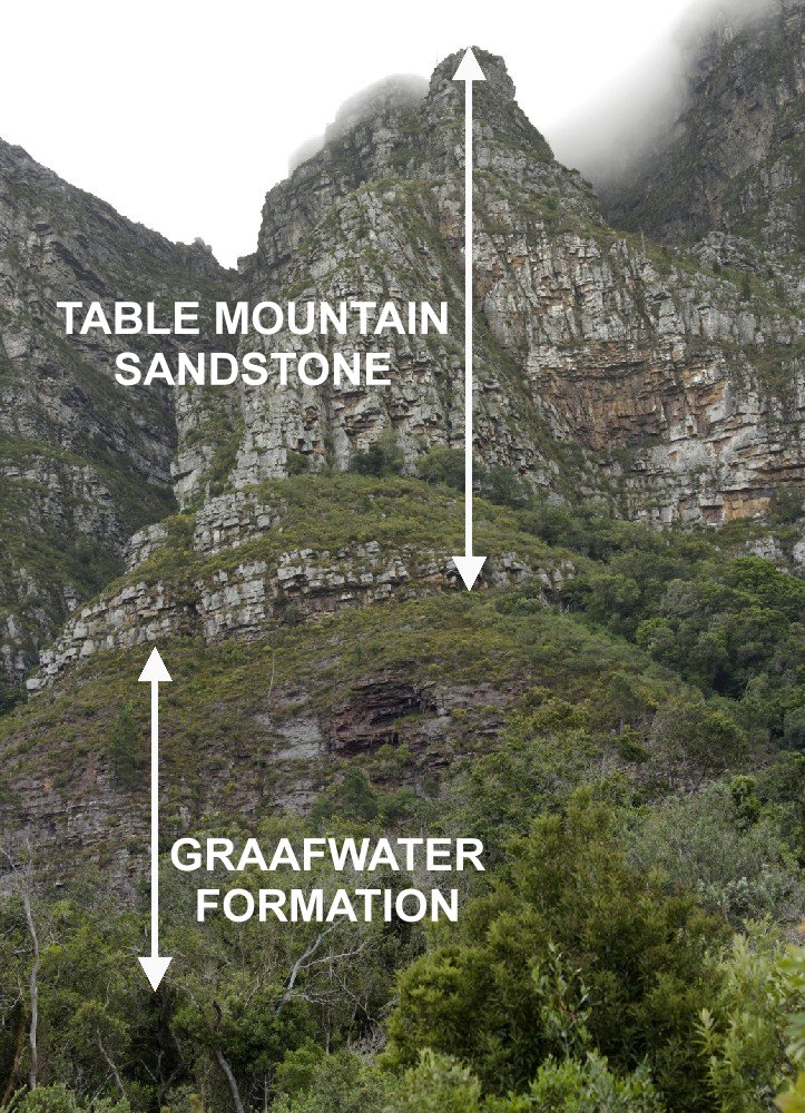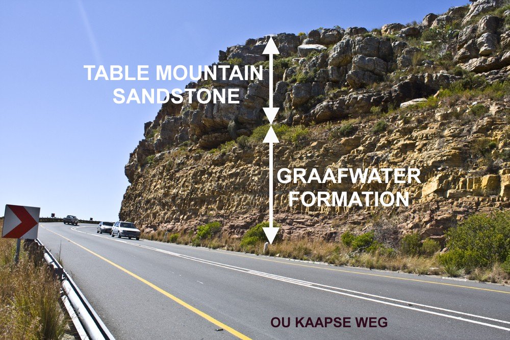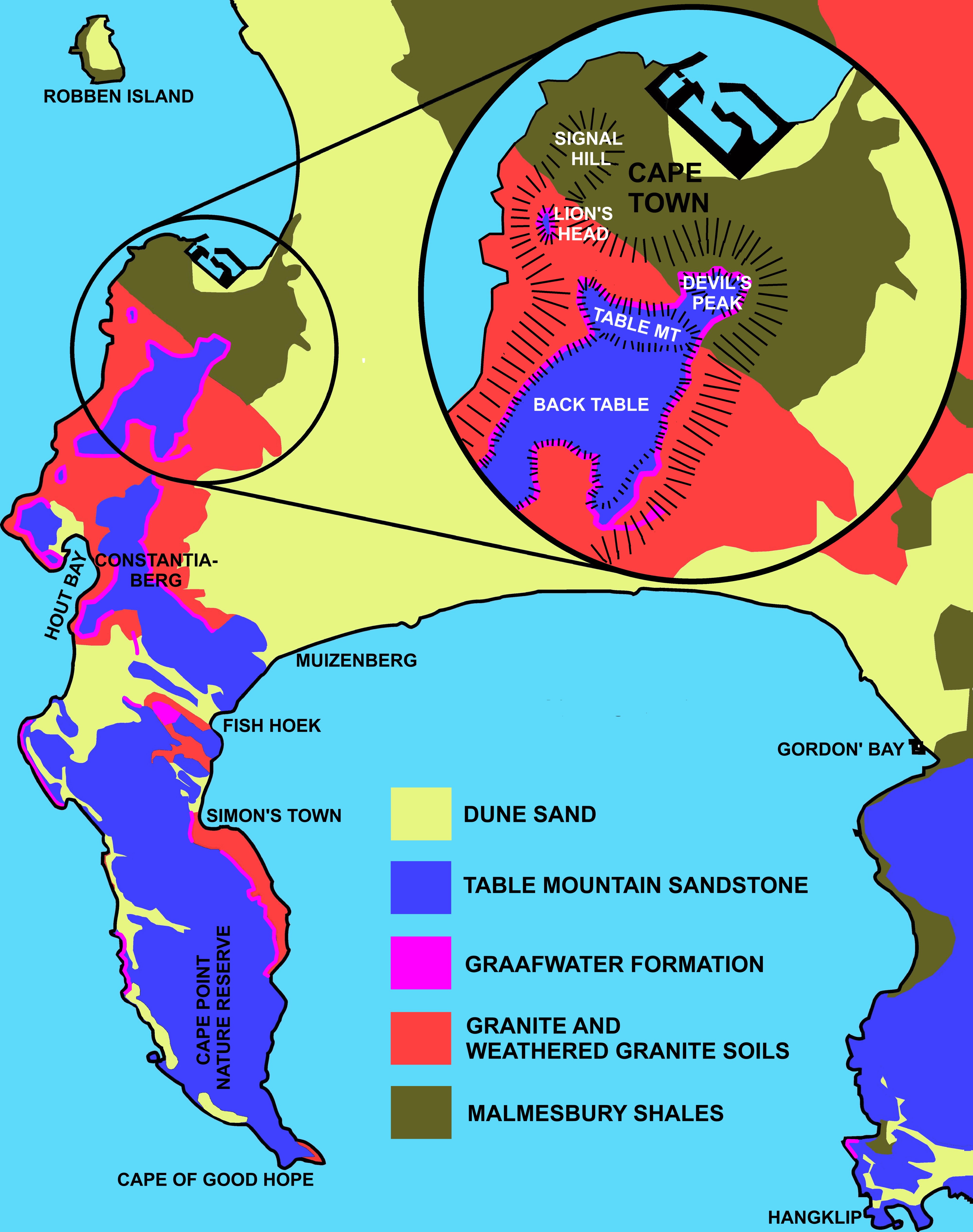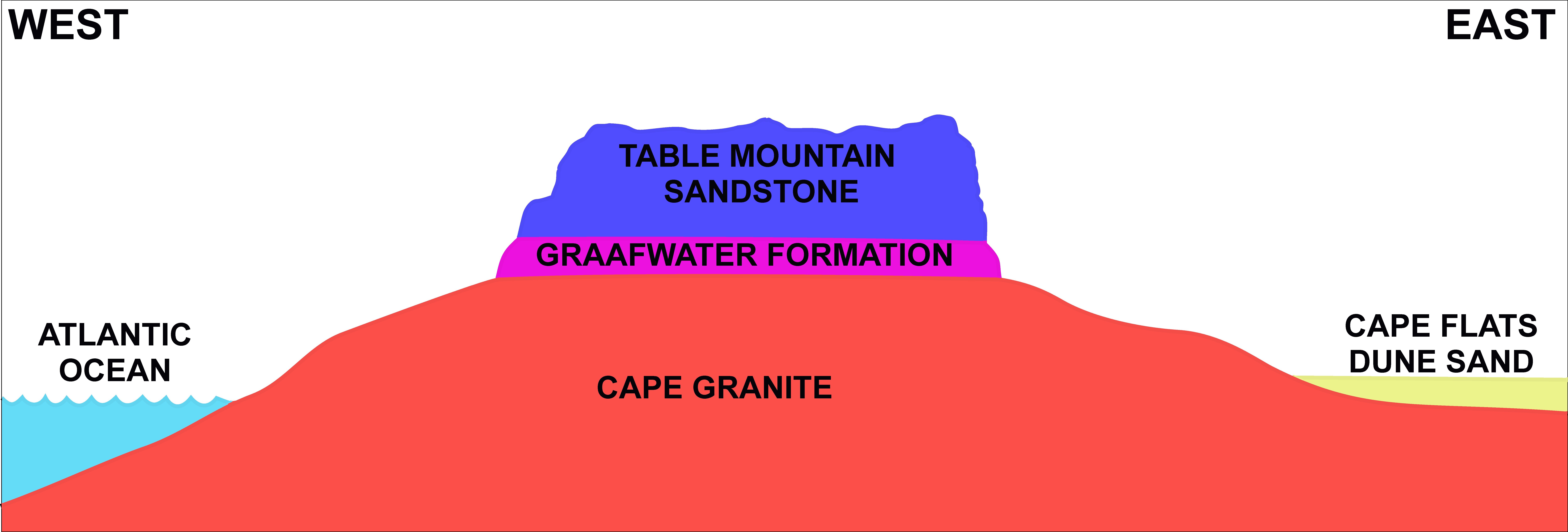 케이프 슈퍼그룹의 퇴적암은 그라프워터 및 페닌슐라 지층의 일부가 남아 있으며, 2억 8천만 년에서 2억 1천만 년 전에 융기된 후 중생대 동안 광범위하게 침식되었다. 이 지역은 제3기 동안 지질학적으로 안정되어 내구성이 강한 사암이 느리게 벗겨졌다. 침식률과 배수는 단층선과 균열의 영향을 받아 테이블 마운틴과 같이 가파른 측면의 잔존 덩어리가 남았으며, 이는 침식된 물질의 퇴적물로 둘러싸여 오래된 암석 위에 덮여 있다.
