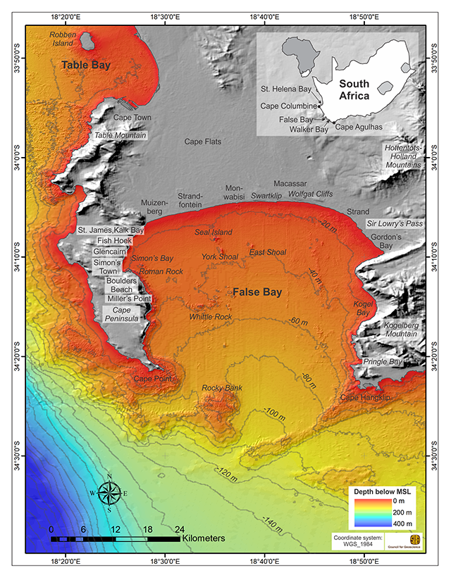 폴스만(False Bay)의 수심은 케이프반도 서쪽 해안과 다른 특징을 보인다. 서쪽 해안의 해저는 폴스만보다 더 가파르게 깊어지는 경향이 있다. 해안 가까운 곳은 얕지만, 수심 100m 등심선은 서쪽 해안에서 약 10km 이내에 나타난다. 반면, 폴스만 전체는 가장 깊은 곳도 수심이 약 80m를 넘지 않는다. 폴스만의 해저는 북쪽 해안의 완만한 해변에서 만 입구까지 비교적 평탄하게 기울어져 있으며, 해안선 근처를 제외하면 동쪽에서 서쪽까지 수심이 비교적 일정하다.