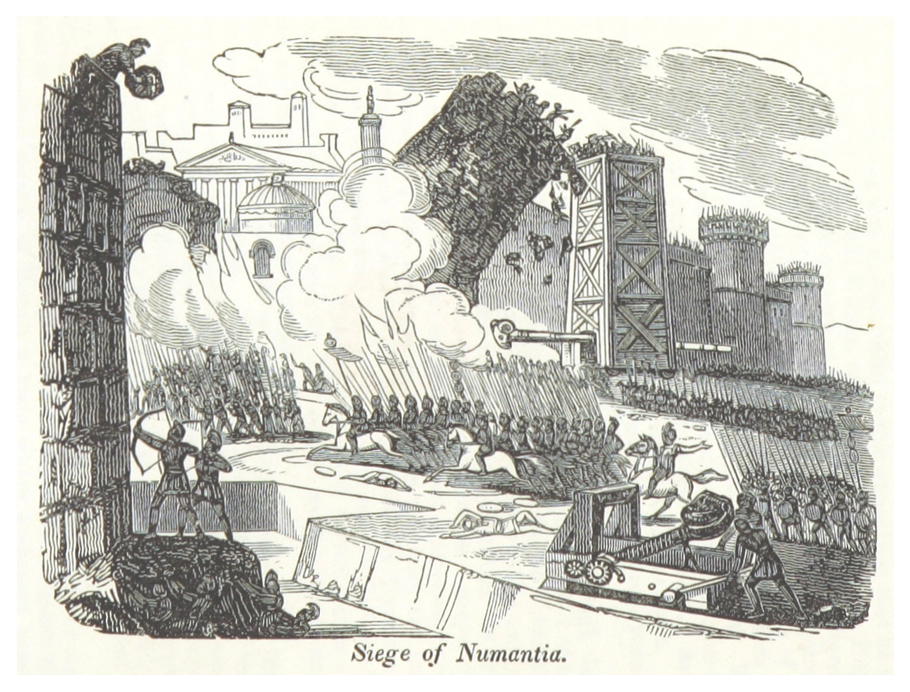 근처 들판은 황폐해졌고, 사용되지 않은 것은 불에 탔다. 누만티아의 요새는 해자와 울타리로 둘러싸였고, 그 뒤에는 높이 10피트의 성벽이 있었다. 100피트마다 탑이 세워졌고, 투석기와 발리스타가 설치되었다. 근처 강을 봉쇄하기 위해 통나무가 물에 놓였고, 해안에 밧줄로 고정되었다. 칼날과 창촉이 나무에 박혔고, 강한 물살에 회전했다. 동맹 부족들은 증원군을 보내라는 명령을 받았다. 나중에 로마에 반란을 일으킬 유구르타조차도 누미디아에서 12마리의 전투 코끼리를 데리고 파견되었다. 로마군은 이제 6만 명에 달했고, 포위된 도시 주변에 7개의 진영으로 배치되었다. 누만티아인들은 "죽을 준비가 되어 있었지만, 싸울 기회가 주어지지 않았다".[15]