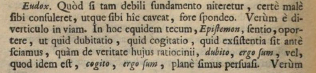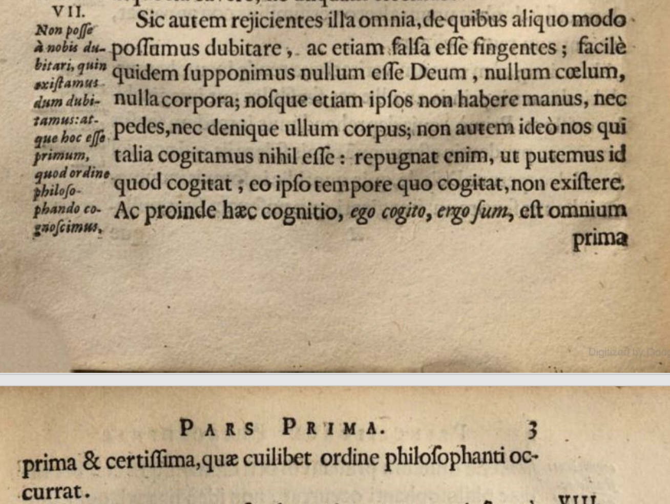 (번역) 우리의 감각은 때때로 우리를 속이기에, 나는 우리에게 나타나는 모든 것이 실은 존재하지 않는다고 가정하기로 하였다. 그리고 합리적인 사람도 종종 오류에 빠지기 때문에, 또한 잘못된 논리에 빠지는데 이를테면 가장 단순한 기하학적 사실에서도 마찬가지이다. 다른 사람들과 마찬가지로 종종 오류를 저지르는 나로서는 여기에 제시된 모든 합리를 거짓이라고 치부할 것이다. 그리하여 마침내, 우리가 깨어있을 때 경험하는 것과 정확히 같은 사상을 꿈속에서 겪는다면 무엇이 진실인지 분간할 수 없을 것이고, 따라서 나는 내가 깨어있을 때 내 마음에 들어오는 모든 대상 역시도 내가 꿈속에서 보는 환상과 마찬가지로 진리가 아닐 수 있다고 가정할 것이다. 그러나 이와 같은 관찰에서 즉각적으로 알 수 있는 것은 내가 이 모든 것을 거짓이라 생각한다는 것이고, 이처럼 생각하는 내가 어딘가에는 존재하여야 한다는 것이 절대적으로 필요하다. 이러한 진실을 발견한 바에 따라 '''나는 생각한다. 그러므로 나는 존재한다'''는 명제는 터무니없는 회의주의적 의심으로도 흔들리지 않는 참이다. 따라서 나는 확신을 가지고 이를 철학의 제1원리로 결정할 수 있다.[67]