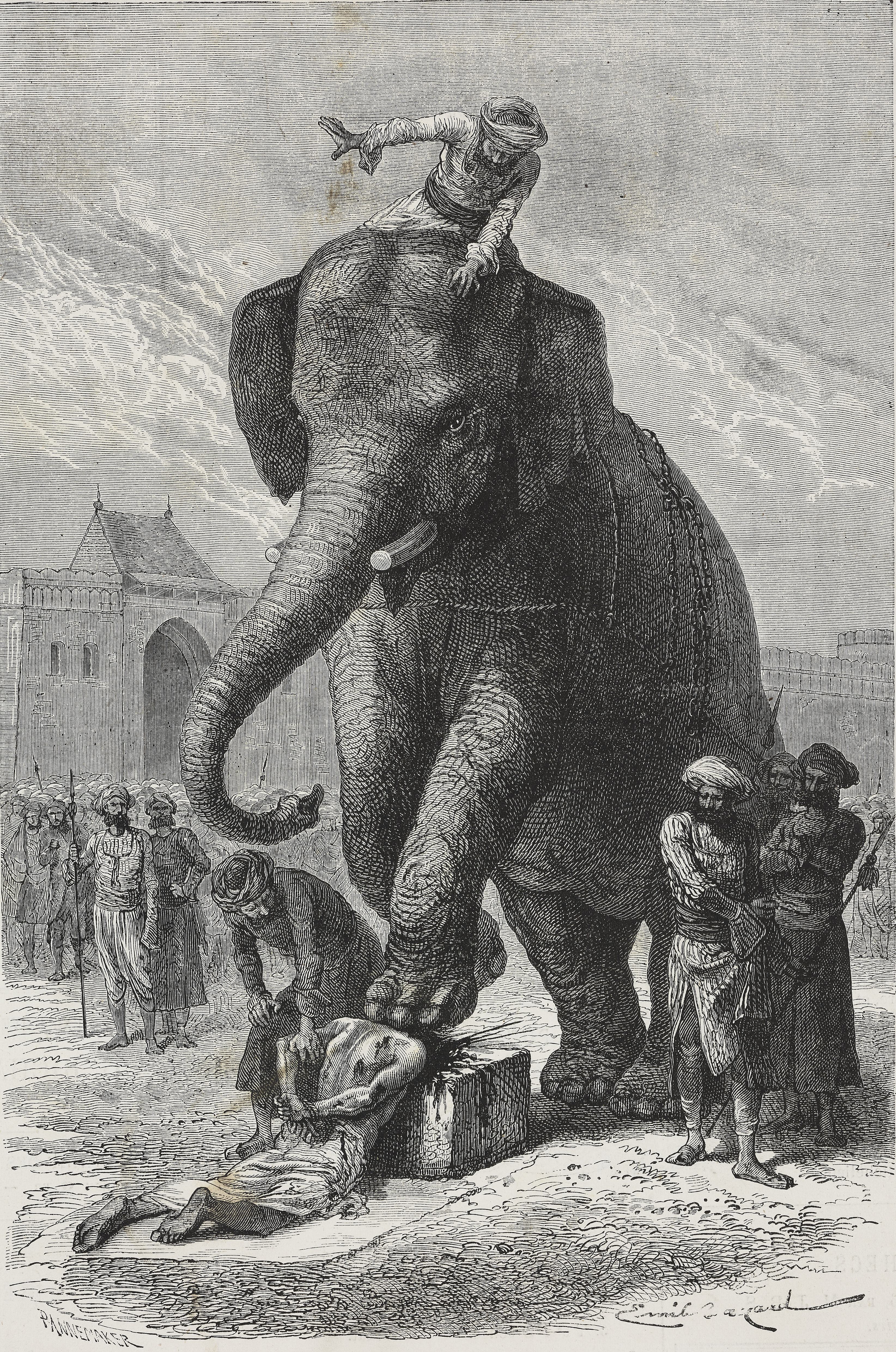 사형 집행인으로서의 코끼리 이용은 19세기 후반까지 이어졌다. 1868년 인도 중부 원정 중, 루이 루슬레는 코끼리에 의한 범죄자 처형을 묘사했다. 처형을 그린 스케치는 사형수가 단 위에 머리를 올려놓고, 그곳에서 코끼리가 그의 머리를 발 아래에 깔아 으깨는 모습을 보여주었다. 그 스케치는 목판화로 만들어져 프랑스에서 널리 배포된 여행·모험 잡지 『세계 여행』이나 『하퍼스 위클리』와 같은 외국 잡지에 게재되었다.[52]