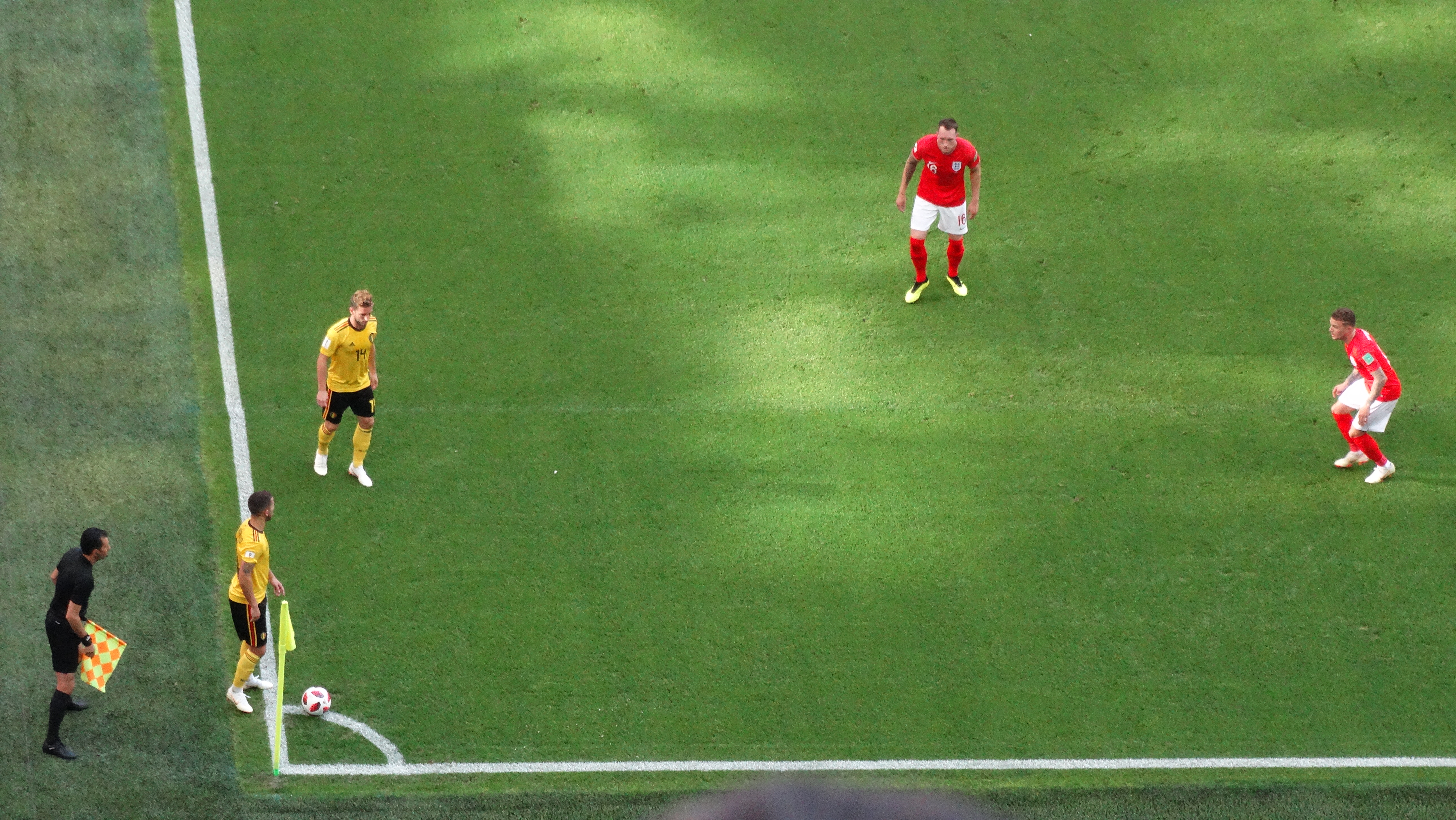 - 공은 경기장 안의 '''코너 깃대에서 반지름 약 0.91m의 1/4원으로 형성된 코너 구역''' 내 지면에 고정되어 있어야 한다.[98][99]