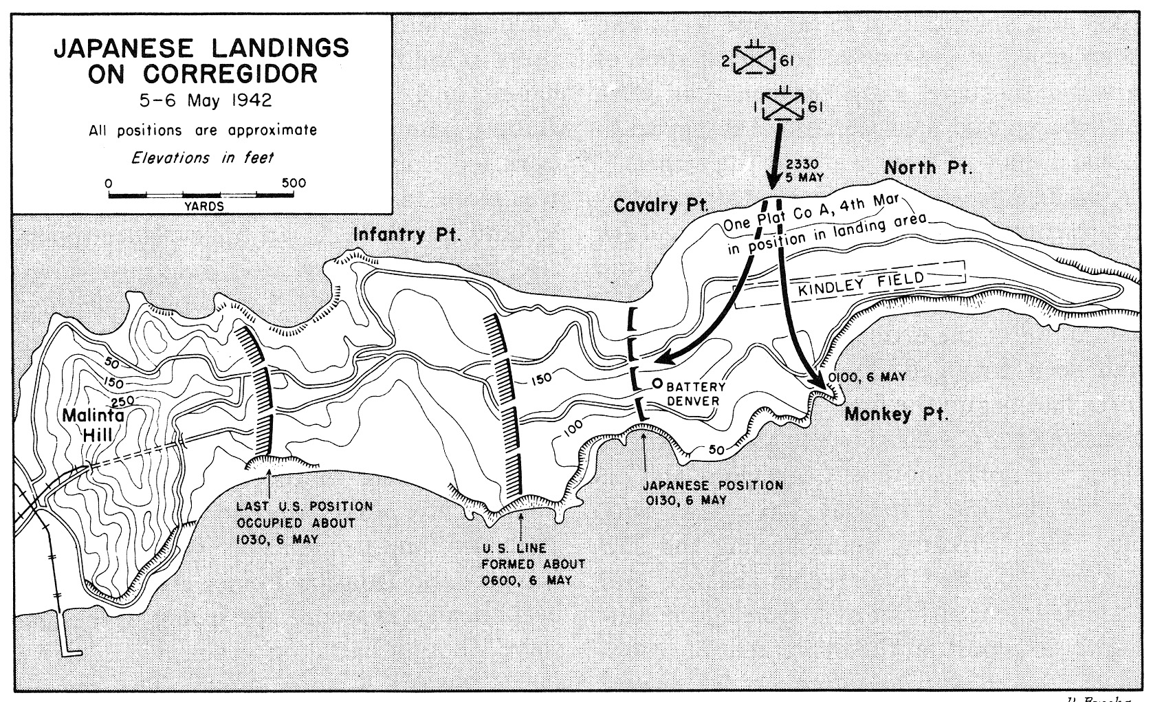 일본군 제1대대는 오후 11시에 코레히도르에 상륙했고, 제2대대는 거의 한 시간 후에 상륙했다. 그러나 해류의 영향으로 제21공병연대 바지선은 일본군을 말린타 언덕에서 더 떨어진 노스 포인트 동쪽에 상륙시켰다. 일본군은 큰 피해를 입었지만, 해안에 상륙하여 교두보를 확보하는 데 성공했다. 오전 1시 30분까지 덴버 포대와 워터 탱크 언덕(Water Tank Hill)의 전면 경사면이 일본군에게 점령되었다.[5]