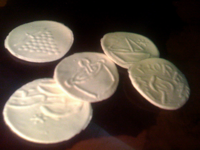 양면에 무늬를 새기는데, 한쪽에는 자세한 디자인을, 다른 쪽에는 간단한 디자인을 사용한다. 과거에는 한쪽에 가문의 문장을 새겼지만, 요즘에는 메이커의 엠블럼이나 지역의 상징을 새겨 표시한다. 전형적인 문양은 지역 특산물인 과일이나 해산물, 항해하는 선박이나 건물, 일몰, 야자수 등이다.[10][13] 결혼식에서도 널리 사용되며, 집에서 만들어 먹기 위해 주조 제조자들이 맞춤 제작을 하기도 한다.[12]