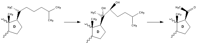 프레그네놀론은 콜레스테롤로부터 합성된다. 이 반응에서는 C20과 C22 사이에 히드록실화 반응이 일어난다. 이 반응을 일으키는 효소인 시토크롬 P450scc는 미토콘드리아에 있으며, 뇌하수체에서 분비되는 부신피질자극호르몬, 난포자극호르몬, 황체형성호르몬에 의해 조절된다.