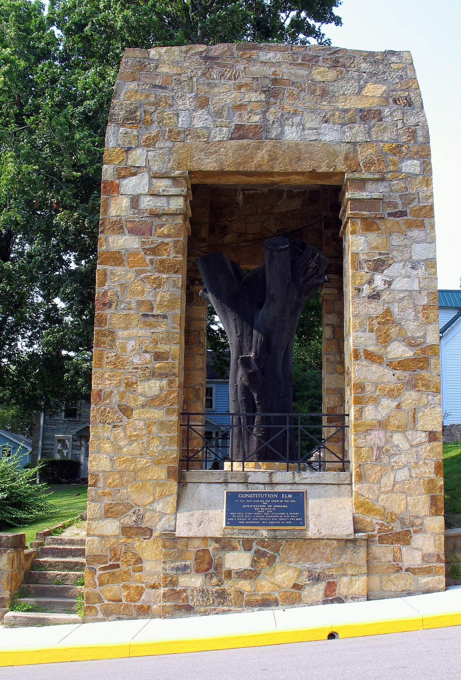 1816년 4월 19일, 제임스 매디슨 대통령은 인디애나 주의 주 승격을 고려하기 위해 코리던에서 열리는 회의에 대표를 선출하는 내용을 담은 주 승인 법안에 서명했다.[22] 해리슨 카운티 출신 5명을 포함한 43명의 대표들이 1816년 6월 10일부터 29일까지 모여 인디애나의 첫 번째 주 헌법 초안을 작성했다.[22][23] 헌법 전문은 역사적인 모임 장소를 다음과 같이 명시하고 있다. "우리는 1816년 6월 10일 월요일 코리던에서 모인 인디애나 영토의 대표들,..."[24]대표들은 아직 완공되지 않은 해리슨 카운티 법원 근처의 미완성 통나무집에서 회의를 열었다. 비좁은 환경과 여름 더위 때문에 대표들은 종종 거대한 느릅나무 아래에서 휴식을 취했는데, 이 나무는 나중에 헌법 느릅나무라고 불렸다. 1825년 네덜란드 느릅나무병으로 나무가 죽었지만, 나무의 일부는 1930년대 대공황 시대에 WPA(Works Progress Administration, 연방사업진흥국)가 건설한 사암 기념관으로 둘러싸여 보존되어 있다.[25][26][27] 대표들은 19일 만에 작업을 완료하고 1816년 6월 29일에 휴회했으며, 새로 서명된 주 헌법이 발효되었다.[28] 1816년 헌법 제11조 11항에 명시된 바와 같이, "해리슨 카운티의 코리던은 1825년까지, 그리고 법에 의해 이전될 때까지 인디애나 주의 정부 소재지가 된다."[29]