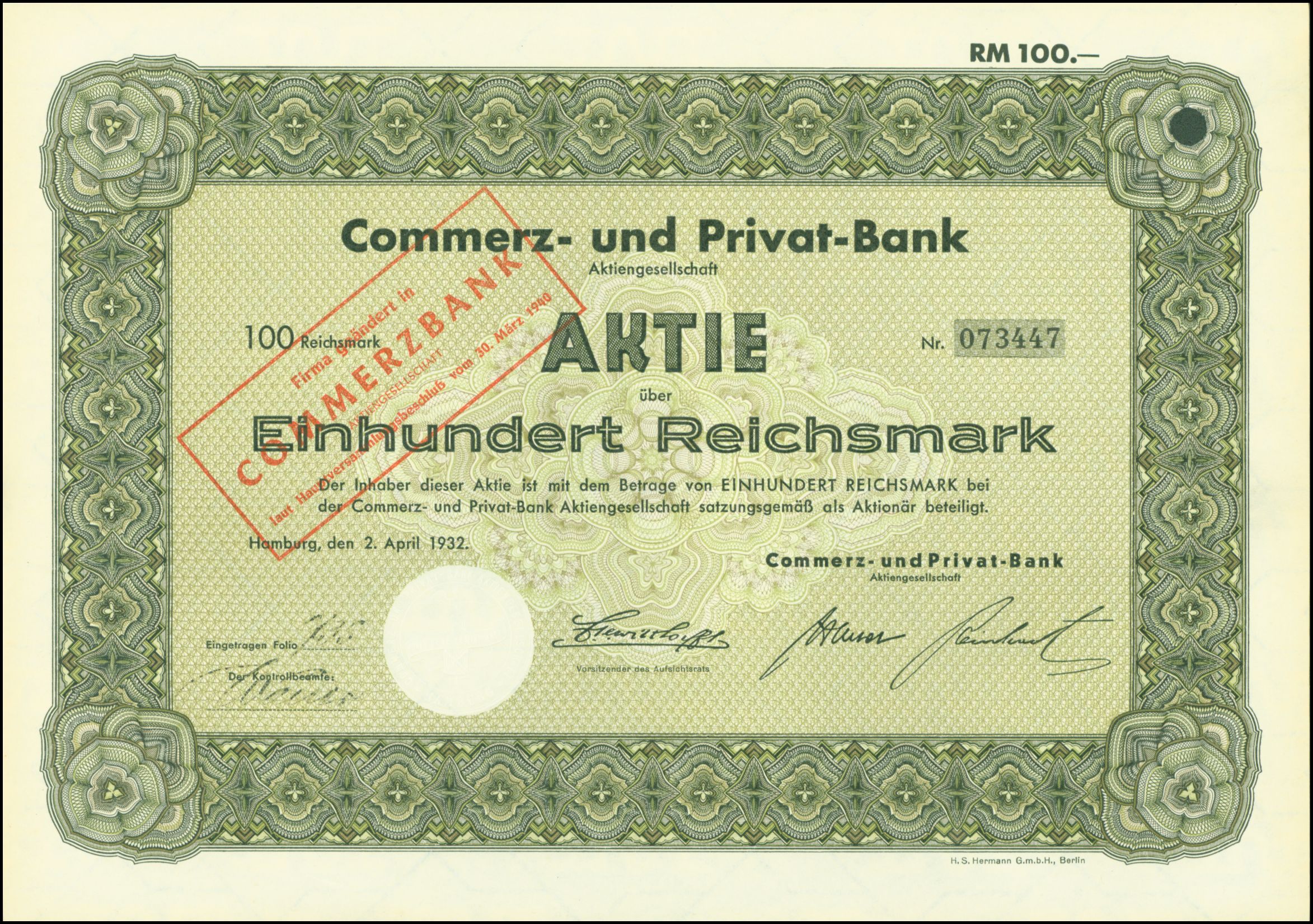 1931년, 코메르츠-운트-프리바트-방크(Commerz- und Privat-Bank)를 포함한 여러 은행들은 통화 및 금융 위기 동안 어려움을 겪었다. 1932년 2월, 라이히 정부는 코메르츠-운트-프리바트-방크를 바르머 방크파라인(Barmer Bankverein)과 합병하고, 기관을 안정시키기 위해 부분적으로 국유화했다. 이 은행은 라이히와 국영 골드디스콘트방크(Golddiskontbank)가 70%를 지배했다.[11] 그 주식은 1937년 민간 주주들에게 다시 매각되었다.나치 독재 시대 동안, 이 은행은 과도한 확장을 추구하지 않고 정치적 요구에 적응했다.[10] 1932년 11월, 코메르츠-운트-프리바트방크의 최고경영자 프리드리히 라인하르트(Friedrich Reinhart)와 회장 프란츠 하인리히 비트호프트(Franz Heinrich Witthoefft)는 아돌프 히틀러(Adolf Hitler)를 총리로 임명할 것을 파울 폰 힌덴부르크(Paul von Hindenburg) 대통령에게 권고한 기업 지도자들의 청원인 산업계의 건의(Industrielleneingabe) 서명자들 중에 있었다.[10] 권력 장악 후, 감독 이사회와 경영 이사회의 유대인 구성원들은 축출되었다. 1938년부터 이 은행은 더 이상 유대인 직원을 고용하지 않았다.[12]