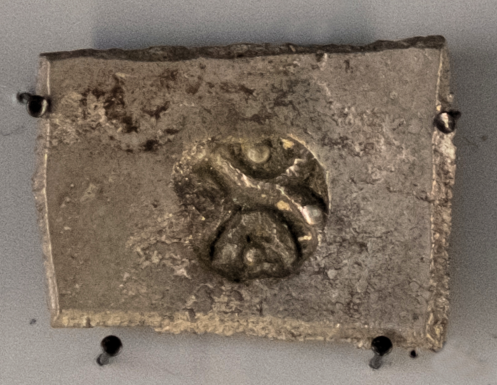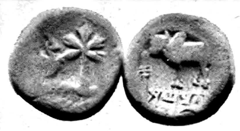 '''뒷면''': 이름 아야미타사, 왼쪽을 향하는 기둥에 혹이 있는 황소.