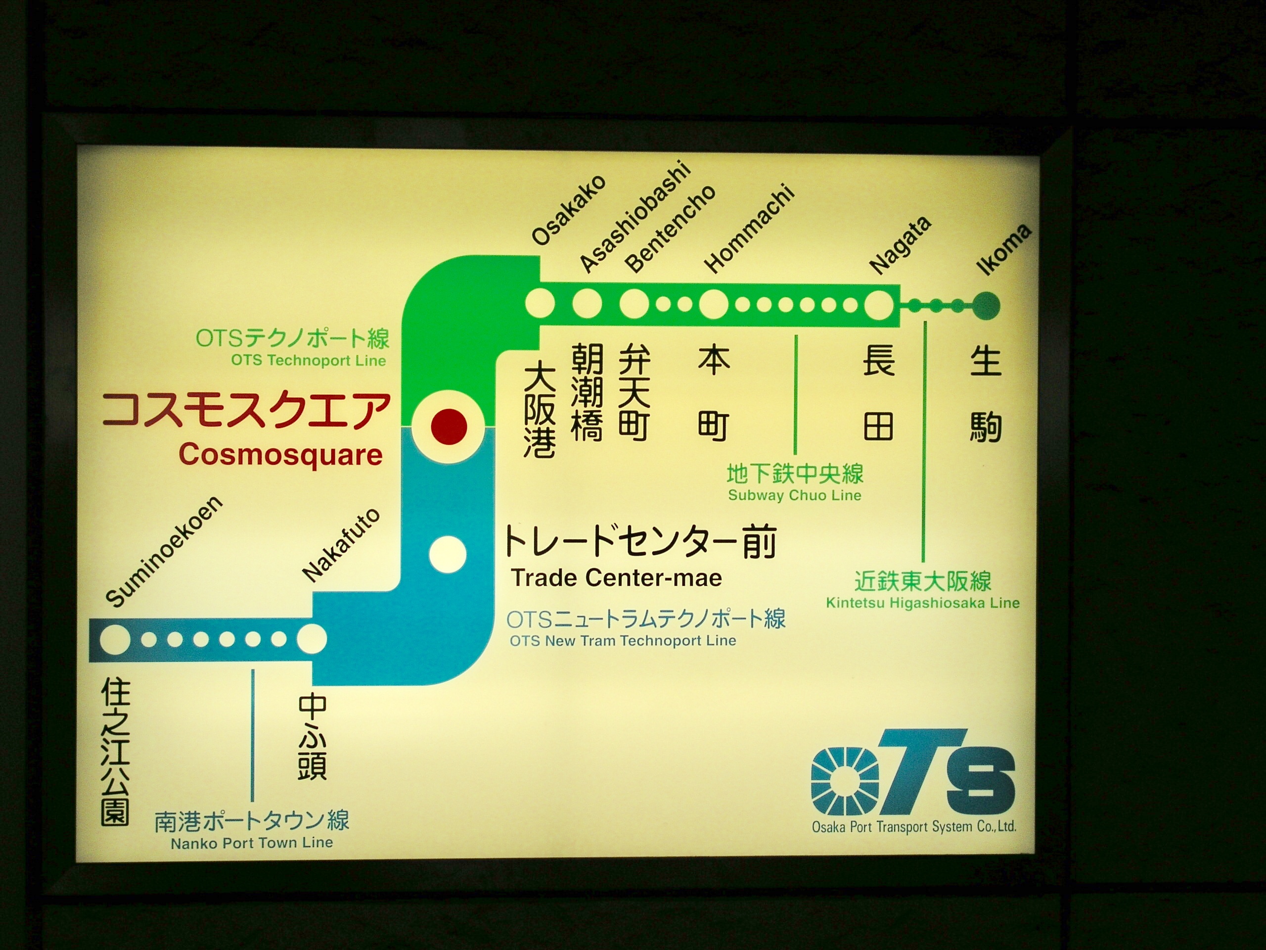 오사카 메트로 난코 포트타운선(뉴트램)은 코스모스퀘어역(P09)에서 트레이드 센터마에역(P10)을 잇는다.