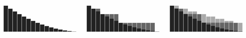 두 번째 부등식을 확인하려면, 이 두 급수를 다시 2의 거듭제곱 길이의 묶음으로 묶지만, 아래와 같이 "오프셋"하여 의 묶음이 로 ''시작''하여 의 묶음이 로 ''끝''나는 묶음과 정렬되도록 하여 전자가 후자보다 항상 "앞서"도록 한다.
