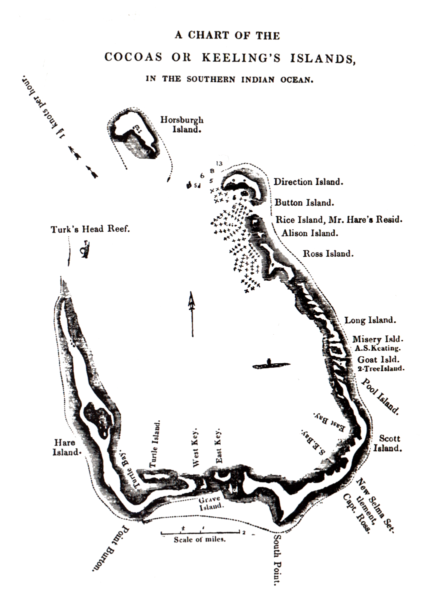 1826년 영국인 알렉산더 헤어(Alexander Hare)가 약 100명의 말레이인을 데리고 코코스 제도에 이주했다. 말레이인들은 아이들은 그의 생활을 돌보고, 어른들은 코코넛 농장에서 일하게 되었다. 존 크루니즈-로스(John Clunies-Ross) 일행 23명은 그 이듬해 섬에 왔는데, 헤어와 로스가 섬에 도착했을 때 코코넛이 무성한 무인도였지만 코코넛 나무 줄기에 아라비아 문자가 새겨져 있었다고 한다. 로스는 헤어의 부하였지만, 결국 로스가 헤어를 섬에서 쫓아내고 섬의 영주가 되었다.1857년 영국 함대가 상륙하여 영유를 선언하고 영국령이 되었는데, 이는 같은 "코코야자 제도"라는 이름을 가진 안다만 제도의 코코스 제도(현재 미얀마령)를 영유 선언하는 것을 잘못한 것이다. 그러나 외국 선박의 침범에 시달리던 크루니즈=로스 가문은 영국의 군사적 보호 아래에 들어가는 것을 원했기 때문에 이 착오는 취소되지 않았다. 이때는 영국령 스리랑카에 속해 있었다.