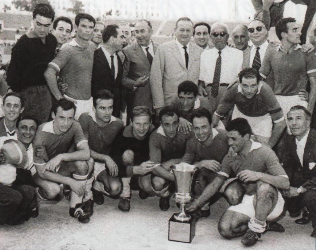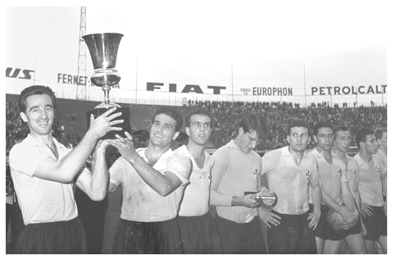제2차 세계 대전으로 인해 1942-43 시즌 이후 중단되었던 코파 이탈리아는 1958년에 재개되었다.[2] 1958년 FIFA 월드컵 본선 진출 실패에 따라, 1958-59 시즌이 몇 달 앞당겨 개막했다. 1958 시즌에 라치오가 우승하면서 코파 이탈리아 우승팀에게 주어지는 "삼색 모표"를 최초로 사용했으며, 이는 리그 사무국에서 공식적으로 채택했다. 1959-60 시즌에는 유벤투스가 우승하여 최초로 ''2관왕''을 달성했고, 현재 사용되는 이탈리아 국기를 상징하는 삼색 에나멜 장식이 있는 황금 트로피가 처음으로 사용되었다.2. 5. 1950년대