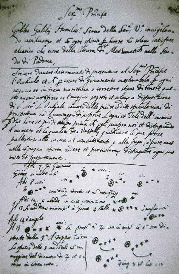 갈릴레이는 며칠에 걸쳐 목성을 관찰하는 동안 목성 주위에 있는 네 개의 별이 위치가 바뀌는 것을 발견하고, 이들이 목성을 공전하는 위성이라는 결론을 내렸다.[19] 이는 모든 천체가 지구 주위를 돈다는 아리스토텔레스의 우주론에 모순되는 것이었다.[20]